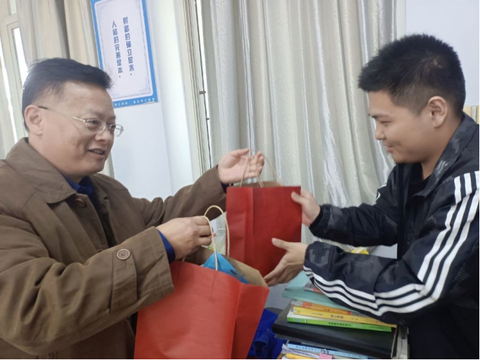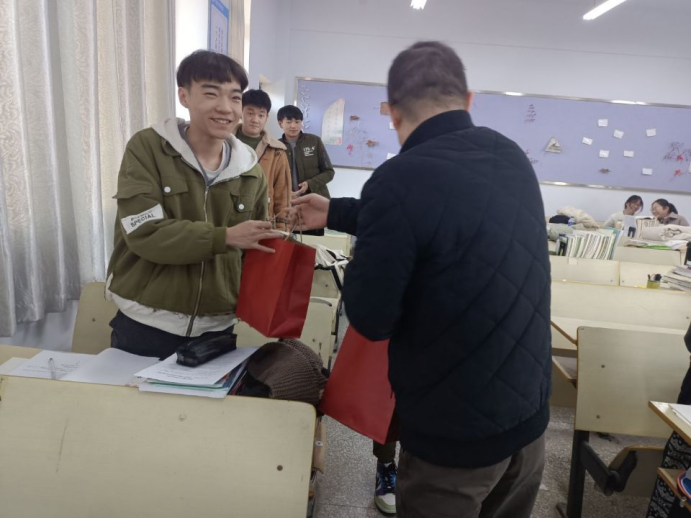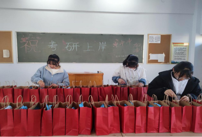 在自习室,党委书记米启超详细了解了考研学生的学习生活情况,鼓励同学们坚定信心、保持恒心,抓住最后的关键时期,调整好身体和心理状态,用最自信的态度迎接考试,如遇困难及时向学院反映。接着,老师们为考研学子送上学院精心准备的暖心礼包,里面包括寓意“心想事成”的橙子、学弟学妹们的祝福贺卡以及一些防疫物资,让同学们真切感受到学院对考研学子的关心和重视。