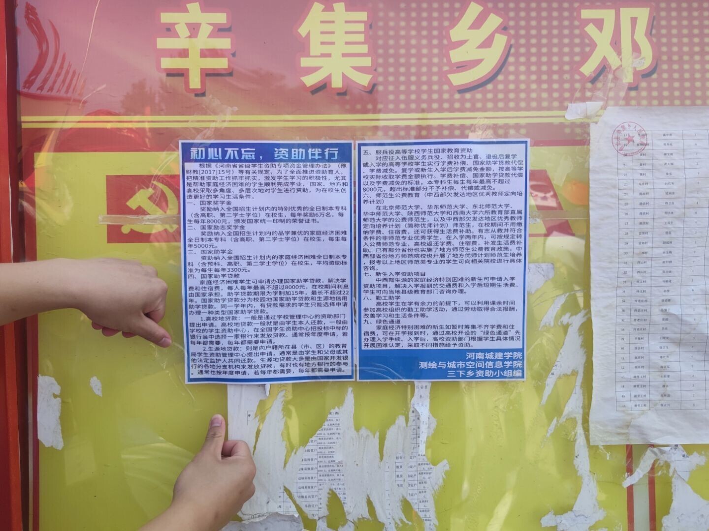 (通讯员 陈金辉)2021年7月1日,yl7703永利集团2021暑期“三下乡”“护航梦想,资助同行”服务小队正式开始进行暑期三下乡的社会实践活动,为响应国家党中央、国务院关于资助政策的号召,保证资助政策的深入实施,扩大宣传力度,让基层全面、准确地了解国家资助政策。团队成员围绕“护航梦想,资助同行”主题深入河南省平顶山市鲁山县辛集乡邓寨村开展宣传活动。