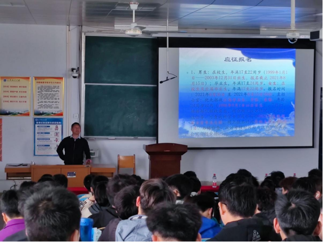 (通讯员:许东辉 王梦雨)为响应国家征兵政策,确保征兵工作高质量、高标准完成,我院加大征兵宣传力度,召开专场征兵工作会议。4月13日下午,yl7703永利集团在五号楼316阶梯教室开展2021年春季大学生征兵宣传活动。我院各年级学生代表和有参军意愿的学生参加本次宣讲。校保卫处副部长褚清营、国防教育科王艳杰老师、学院党委副书记卫柳艳、团学办以及辅导员参加宣讲。