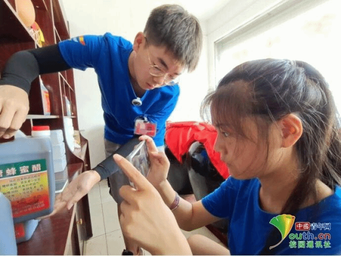 图为实践团志愿者对冯异醋厂商品醋进行视频录制。 中国青年网通讯员 李瑞鑫 摄