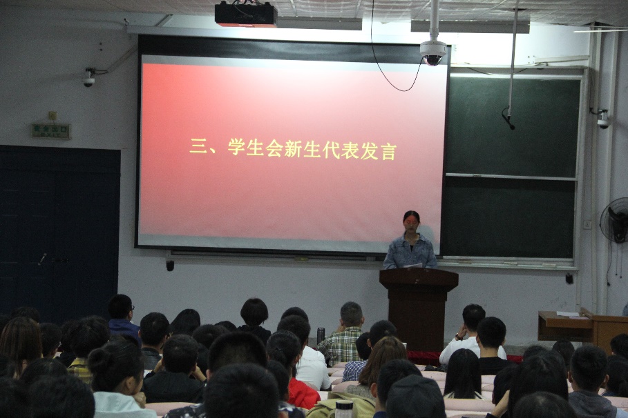 本次会议由许东辉老师主持。首先,全体起立奏国歌。接着,学生会主席潘聪发言,他欢迎18级新生加入学生会,他指出学生会是学校与学生之间关系的桥梁,是学校风采的展示窗口,是同学与老师的感情纽带,是全体学生的温馨家园。学生会的成员要充分发挥个人和集体的力量,认真贯彻学校老师的指示要求,虚心听取同学的意见,全心全意为学院服务。 接着,新生代表李倩倩发言,表达了新生对学生会的向往。学生会是一个展示自我的舞台,加入学生会可以锻炼各种能力。她表明一定会履行自己的责任和义务,不断学习,不断进步,尽心尽责地完成自身的工作,真正服务于同学,服务于学校。最后,党总支书记吕鹏飞讲话。他指出学生会成员要有奉献精神和团结协作精神,各个部门要团结协作、和睦相处,既要保证各部门、成员分工具体、责任明确,又要做到“分工不分家”,所有成员要齐心协力,共同努力。吕书记还强调学生会成员更要努力学习,学生首要的任务是学习,必须在保证学习的前提下干好工作。以真人真事讲述了榜样作用首先是学习上的榜样,这就要在日常的学习、工作、生活中合理安排时间,分配精力,处理好学习与工作之间的关系,保证学习上进步,工作上出色。只有这样才能成为一名优秀的学生干部,成为高智商、高情商、有潜力、有思想、有价值、有前途的大学生。