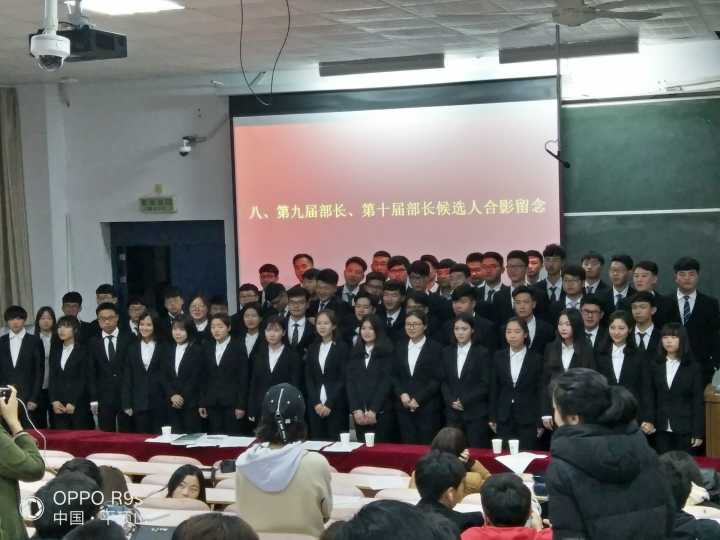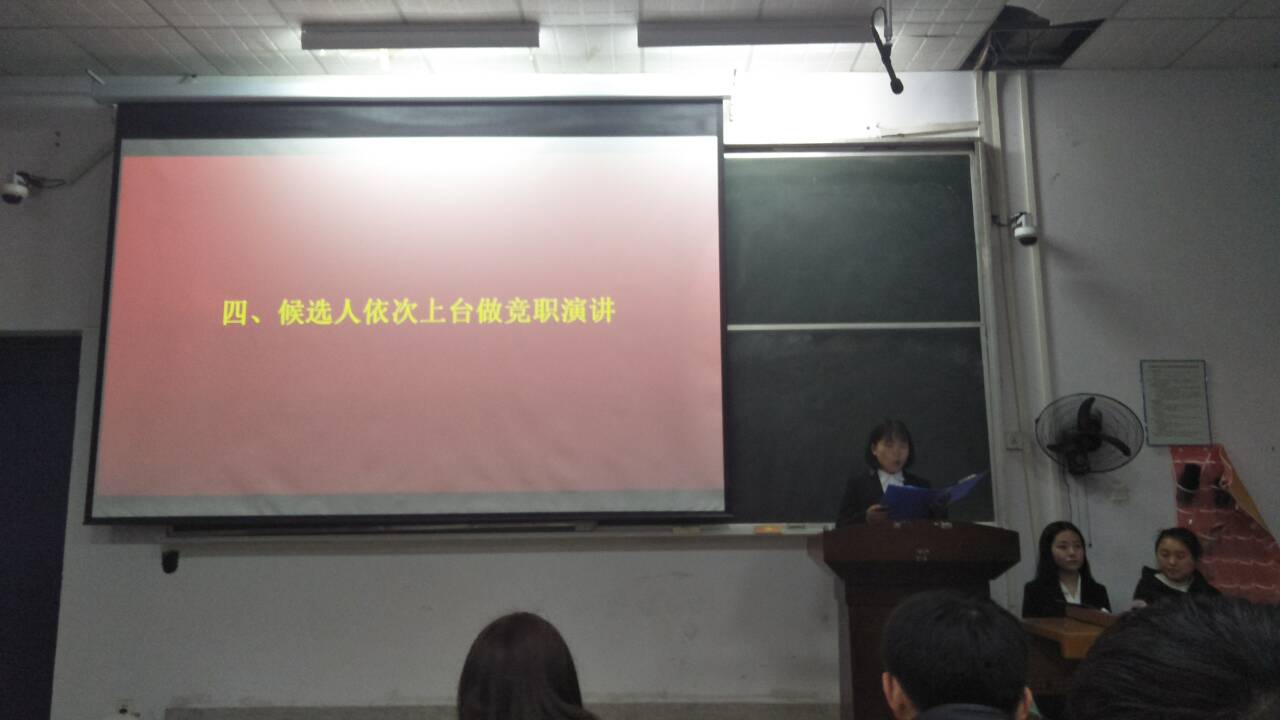 伴随着庄严的国歌声,大会拉开序幕。首先由党总支副书记卫柳艳书记致开幕词。之后竞选人依次上台做竞职演讲。竞选会场十分精彩,每位选手都自信的走上演讲台,他们语言自然流畅,就各自的基本情况、对工作岗位的认识、竞选原因以及工作设想进行了阐述。57位候选人进行了激烈的演说,赢得场下热烈掌声。随后,由场下观众进行了投票,学生代表现场检票,第十届学生会主席潘聪讲话。最后第九届学生会部长以及第十届部长候选人分别合影留念,竞选大会圆满结束。