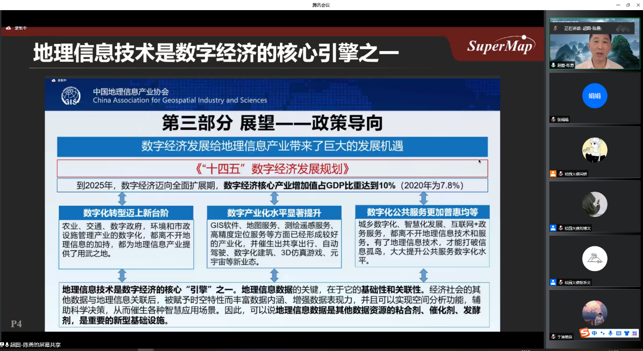 本次活动由超图校园大使团队闫妍、赵乐文、刘博文负责组织,邀请了yl7703永利集团侯绍洋主任和张娟娟老师共同参与指导。超图研究院陈勇副院长进行了《GIS基础软件技术创新与发展》报告讲解,阐述了在数字经济产业飞速发展的前提之下地理信息技术的发展现状与展望。并呼吁了有兴趣的同学们未来可以投身到祖国地理信息技术产业的建设当中去。超图教育生态部王璐老师进行了《参加SuperMap杯高校GIS大赛,赢取多彩人生》报告讲解,鼓励并激励同学们积极参赛。