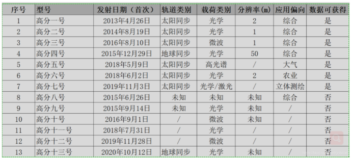 介绍从2013年到2020年中国发射的十三颗“高分”系列卫星,卫星上携带了多种传感器,覆盖了从全色、多光谱到高光谱,从光学、雷达、激光到热红外,从太阳同步轨道到地球同步轨道等多种类型(图1),构成了一个具有高空间分辨率、高时间分辨率和高光谱分辨率能力的对地观测系统。“高分”系列卫星的发射和应用意味着中国具备了各类高分辨率数据自主获取能力、大幅提升了中国的对地观测水平、逐渐缩小了与西方国家在对地观测方面的差距。