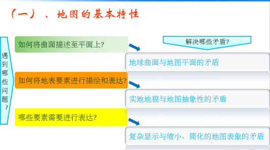在地图学开篇引论中,对地图特性的讲解从制图中遇到的三大矛盾(地球曲面与地图平面的矛盾,实地地貌与地图抽象性的矛盾,复杂显示与缩小、简化的地图表象的矛盾。)出发,引出地图的三大特性,引导同学们从辩证的角度思考问题,解决问题。