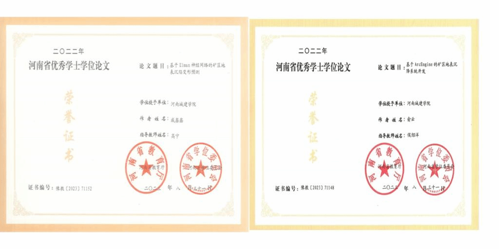 在2022年河南省优秀学士学位论文评选中,我院戚鑫鑫同学的《基于Elman神经网络的矿区地表沉陷变形预测》和俞云同学的《基于ArcEngine的矿区地表沉降系统开发》荣获河南省优秀学士学位论文,高宁老师和侯绍洋老师荣获河南省优秀学士学位论文指导教师。