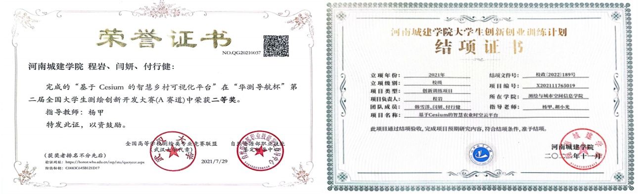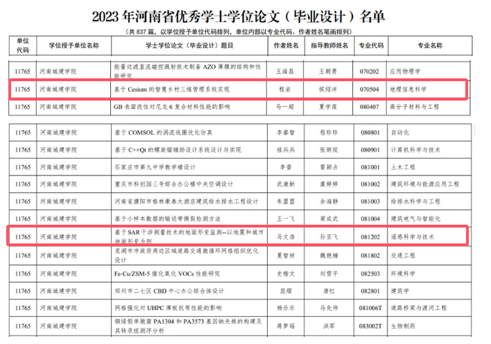 在2023年河南省优秀学士学位论文评选中,我院程岩同学的《基于 Cesium 的智慧乡村三维管理系统实现》和马文浩同学的《基于SAR干涉测量技术的地面形变监测--以地震和城市地面形变为例》荣获河南省优秀学士学位论文,侯绍洋老师和孙亚飞老师荣获河南省优秀学士学位论文指导教师。