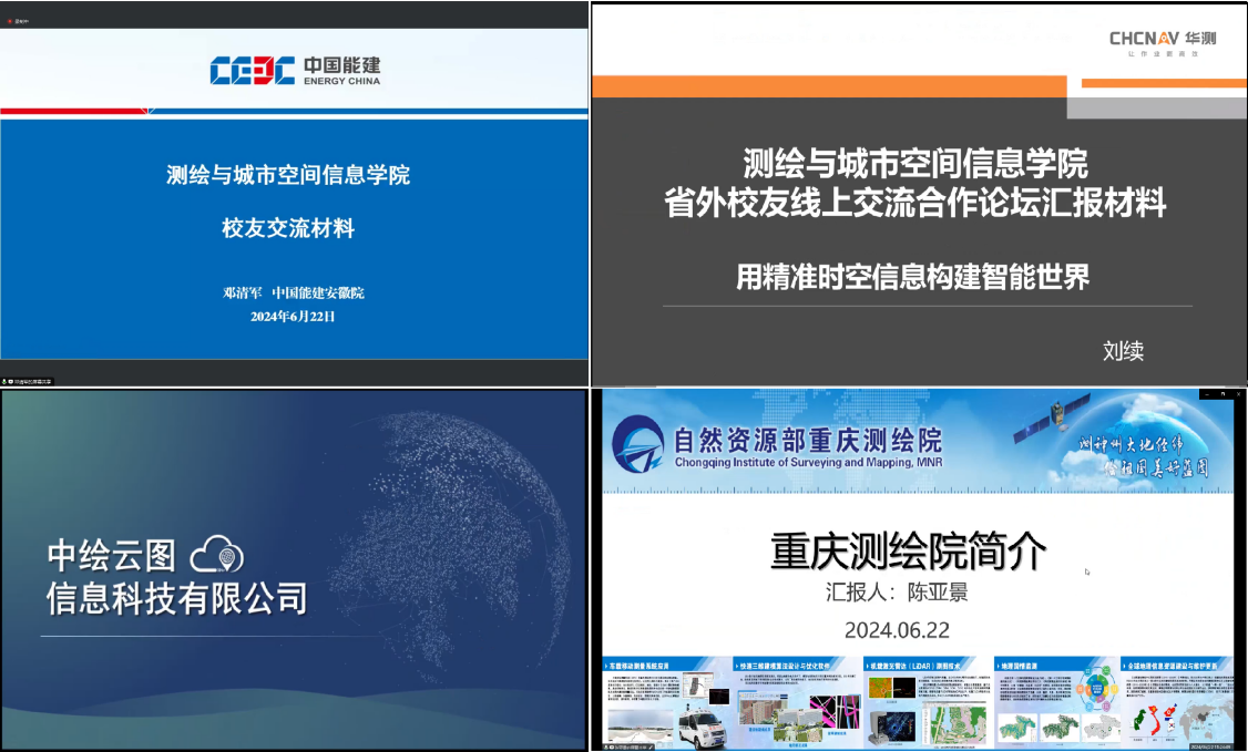 (通讯员:赵苗兴)6月22日上午,yl7703永利集团省外校友线上交流合作论坛通过腾讯会议线上召开,来自安徽、贵州、重庆、福建四地的4名省外校友代表,测绘学院校友分会会长黄继永,测绘学院领导班子成员、教师代表及在校学生共计100余人参加了本次交流,交流会由高分中心主任杨锋主持。