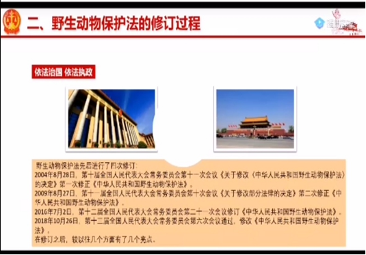 其次,通过野生动物保护相关法律的立法背景以及修订过程来具体介绍《中华人民共和国野生动物保护法》,以生态文明为指导、德法相结合认可了实质性的动物福利。其中第28条规定了实质性保护野生动物;26条规定了不得虐待野生动物。另外还强调了可以通过加强野生动物栖息地的保护来达到保护野生动物的目的,但其中回归科学把驯养繁殖改为人工繁殖仍存在较大的歧义。