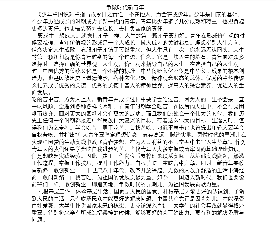 活动发出后,同学们积极学习、记录感悟并投稿,截至7月14日共计26人投稿,投稿作品内容充实,结构完整。投稿中大多数学生对于习近平总书记所提出的青年人要“自找苦吃”,做人做事要“注重细节”,青年学生要给书本上的知识“挤挤水”,才能得到知识“干货”这些内容表示有深刻感悟,并表示要不断提升自己,始终坚守初心,勇担使命,坚定理想信念,为实现中华民族的伟大复兴贡献自己的一份力量。