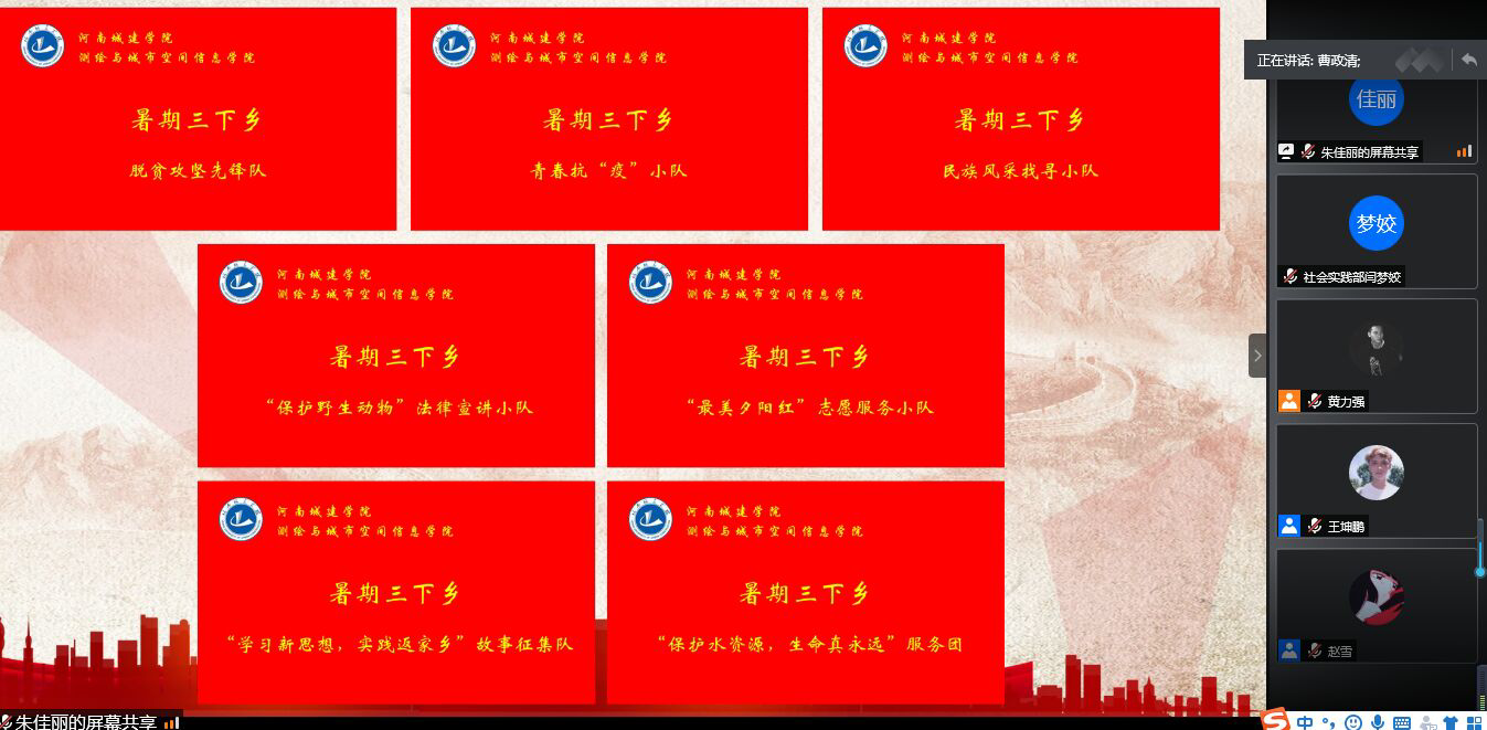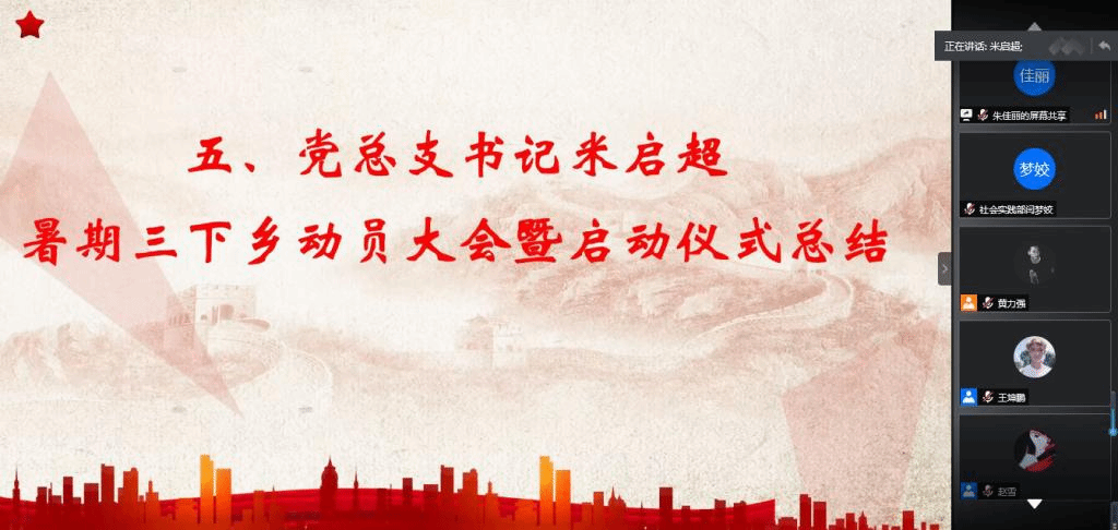 (通讯员  许东辉 刘畅)为响应团中央号召,加强大学生思想政治教育,进一步促进广大学生积极投身社会实践,yl7703永利集团积极组织开展大学生暑期“三下乡”社会实践活动,并于7月6日上午以线上腾讯会议的方式召开了2020年大学生暑期“三下乡”社会实践活动动员大会暨启动仪式。学院党总支书记米启超,党总支副书记卫柳艳,团学办主任许东辉,辅导员常莉,胡小光,李方圆,以及全体成员出席会议。