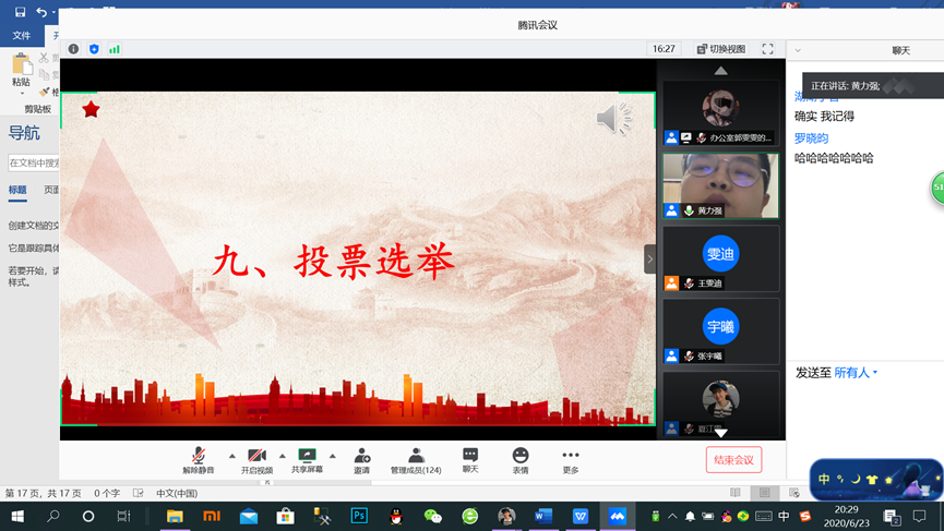 大会伊始,由许东辉老师致开幕词,他表达对学生会成员的殷切期望和对学生干部在工作中的要求,指出学生会是个坚强堡垒,对大家在疫情期间的各种表现给予肯定。在庄严的国歌声中,本次竞选大会正式开始,第一项,由主持人介绍本次大会的竞选职位、竞选流程及注意事项。第二项,分别由现任学生会副主席王坤鹏、现任学生会团总支副书记张志源、现任学生会中心主任曹政清、现任学生会中心主任赵雪宣读候选人资格审查报告、学生代表资格审查报告、大会选举办法以及总监票人、总计票人、监票人、计票人名单,并进行表决。第三项,各位候选人依次进行线上演讲。35位候选人均满怀激情的阐述了自己对工作岗位的认识、竞选原因以及工作设想。第四项,学生代表采用线上投票。第五项,yl7703永利集团学生会主席黄力强发言,并表达了对参加竞选大会的同学们的美好的祝福。最后,主持人宣读了第十一届部长团优秀部长及优秀干事名单,本次竞选大会圆满结束。
