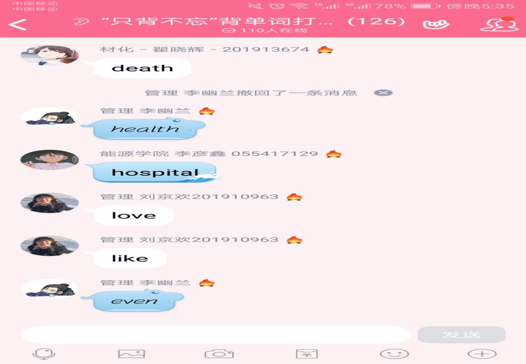 通过此次活动,不仅帮助同学们养成了良好的习惯,实现了自我激励,自我坚持,而且在群里找到了志同道合的朋友,获得了朋友们的鼓励与支持。通过每天的打卡,同学们不断挑战自己,借助打卡平台,互相监督,不断改变,逐渐养成良好的习惯,成为更好的自己。同时在这样一个特殊的时期,也让同学们感受到了生命的真谛,更加增强了同学们的责任感和使命感,不断突破自己,向更好的自己迈进。