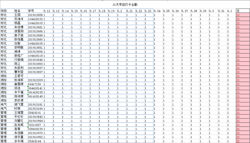 本次打卡活动覆盖整个学校。经统计,全校共有615名同学参与,其中早起打卡全勤人数有56人,健身打卡全勤人数有40人,阅读打卡全勤人数有28人,背单词打卡全勤人数有65人,学习打卡全勤人数有18人,英语听力打卡全勤人数有22人,共229人。经过21天的打卡活动,同学们互帮互助,彼此分享经验,互相监督。在本次活动开始之际,同学们的热情都很高涨,每个人都争在第一个打卡,活动中期,同学们热情不减,依旧每天坚持打卡。经过了二十一天的努力,同学们都取得了很大的进步,不少同学在群里分享自己收获的成果,同学们通过打卡活动收获进步,得到成长和改变,让这次活动变得更加有意义。本次活动能圆满结束,离不开每一位同学的努力。