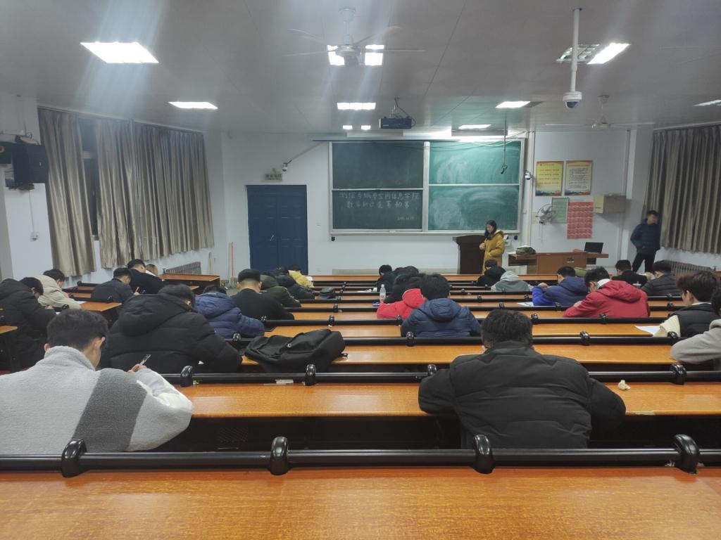 此次竞赛由各个班级自行安排五人参加。初赛和复赛分别定于12月17号在五号楼314和12月18号在五号楼207进行,参赛人员于七点整在第一排签到后开始考试。相关负责人交代过考试要求后,依次给同学们分发卷子,比赛正式开始,此次的考试内容有数学文化与数学近代历史、高等数学理论知识以及趣味数学知识。最后比赛结束,由成绩判定将由宋笑、黄欣雨、高艺敏、陈诗媛、梁勤虎五位同学代表我院参加河南城建信息学院数学知识竞赛。