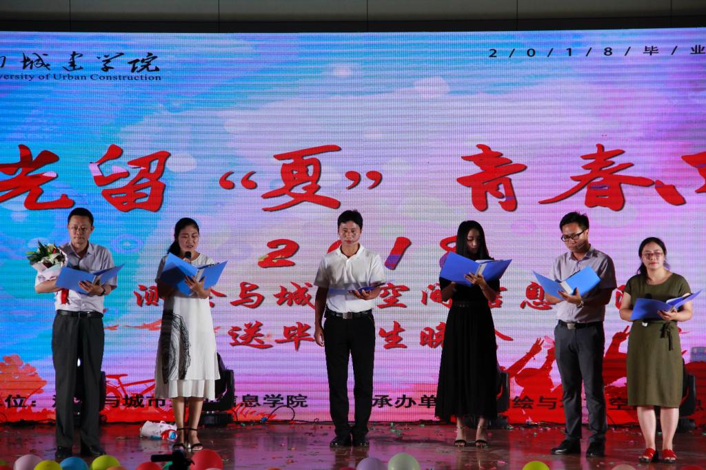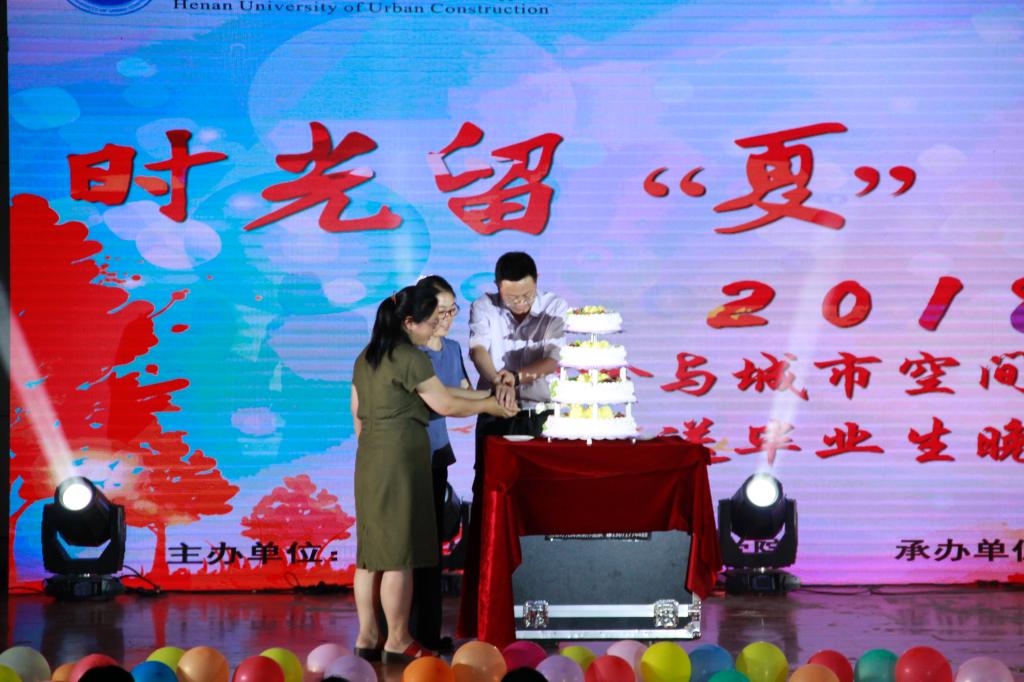 本次晚会经过长达一个月的精心策划和筹备,得到了学院领导的高度重视和大力支持。四年时光飞逝过,一朝欢聚话真情,晚会伊始,吕鹏飞书记为毕业生致辞;张宏敏院长、高松峰副院长、辅导员李艳共同为毕业生切下蛋糕的第一刀,寓意鹏程万里、前程似锦,表达了对2018届毕业生的美好祝愿。晚会节目精彩不断,表演者们用舞蹈、歌曲、相声、小品、影子戏为观众席的老师与同学们带来了一场视觉与听觉的盛宴,把晚会的热情气氛推向高潮,中间更是穿插了现场赠礼物以及微信上墙抽奖互动环节,增加了观演同学的参与度。毕业生代表上台时,播放了学弟学妹们特意录制的祝福视频。晚会上,学院辅导员们的《致毕业生的一封信》为晚会增添了浓浓的师生情,教师们用别开生面的诗朗诵,回顾了与同学们相处的美好经历,用生动诙谐的语言表达和寄托了不舍与祝福,现场观众也被离别氛围深深地感染。最后,教师、毕业生代表以及工作人员合影留念。