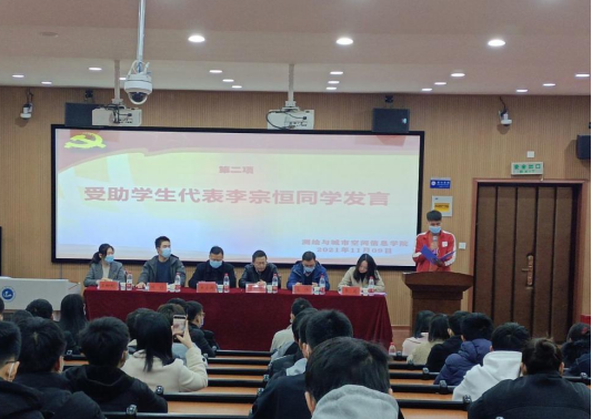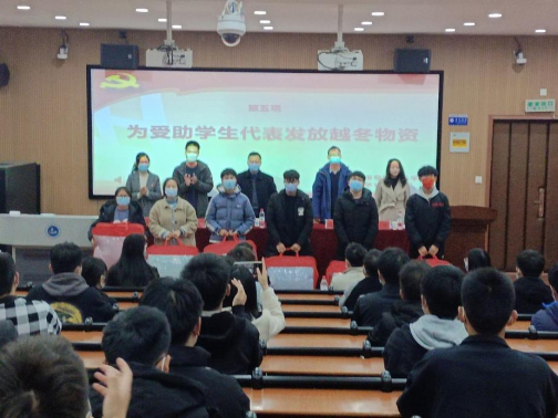 活动开始,由党委副书记卫柳艳致辞。她表示,学校、学院一直以来高度重视困难学生的在校生活问题,此次活动也是为帮助学生解决困难,让同学们更好的安心学习所采取的有效措施之一。之后,李宗恒和胡静同学代表受助学生上台发言。随后,校永利集团部副处长陈舒老师发表讲话,他向同学们介绍了学校特色化、人性化、精准化、多位一体的资助政策,结合自身工作经历肯定了测绘学院历年来开展的物资发放活动。之后,各位老师为受助学生代表发放了越冬物资、学习礼包和生活礼包。