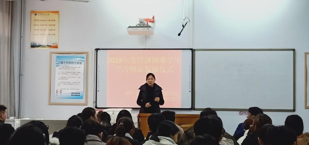 首先,由党总支副书记卫柳艳讲话,她表示学院对真正解决家庭经济困难学生在生活、学习和思想等问题的重视,希望为学生创造一个轻松愉悦学习环境的初心,并希望广大学生尤其是家庭经济暂时有困难的学生,更应该自理自强,刻苦学习,努力工作,全面发展和提升自己的各项能力,将来为社会做出更大的贡献,同时希望大家能将学校对大家的这份爱牢记心间,并这份爱心传递下去。