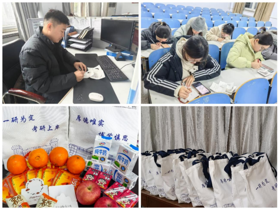 活动开始前,学院为考研学子们精心准备了考研加油包,其中包含老师和同学们手写的祝福卡片、“考研上岸”定制包、“牛”气冲天的牛奶、一战“橙”硕的橙子、“苹”稳上岸的苹果、“温暖随行”的暖贴、“片片顺利”的薯片等,满满的营养与暖暖的关怀,寄托着学院对考研学子们的殷殷期望和美好祝愿。