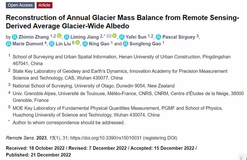 (通讯员:张志敏)近日,测绘学院遥感科学与技术系张志敏博士和孙亚飞博士与中国科学院精密测量科学与技术创新研究院、华中科技大学、新西兰奥塔哥大学和法国国家气象局等国内外科研机构合作,基于MODImLab反照率、SRTM DEM、Landsat数据和冰川平均质量平衡,引入物质平衡-反照率梯度的概念,首次提出了一种不依赖地面实测资料的、普适性和推广性均较强的年际冰川物质平衡重建方法。目前该方法已成功应用于喜马拉雅西段Chhota Shigri冰川2003-2014年年际物质平衡的估算,相关研究成果以“Reconstruction of Annual Glacier Mass Balance from Remote Sensing-derived Average Glacier-wide Albedo”为题发表在国际著名学术期刊《Remote Sensing》(IF:5.4;中科院SCI分区:Q2,Top)上,我院为该文章的第一发表单位。