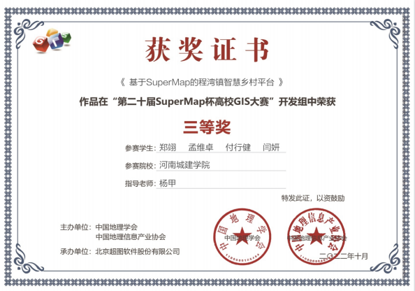 11月5日,第二十届SuperMap杯高校GIS大赛(中国赛区)开发组获奖名单公布。我校yl7703永利集团地理信息科学专业学子郑翊、孟维卓、付行健、闫妍组成的参赛团队在杨甲老师指导下,在本次大赛中获得开发组比赛三等奖。