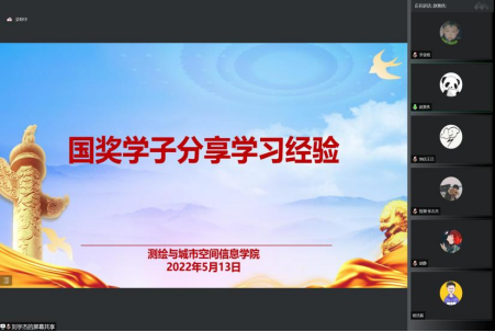 同时,为做好疫情封控期间学业帮扶,5月13日测绘学院开展了线上“国奖学子大讲堂”。本会议邀请了国家励志奖学金获得者吴怡霏、赵乐文、赵紫佚,“词达人”杯英语词汇竞赛河南省二等奖获得者周雨溪等四位同学,宣讲其成长经历、学习经验和职业规划,为我院全体同学指明了前进方向,解答学业疑惑。