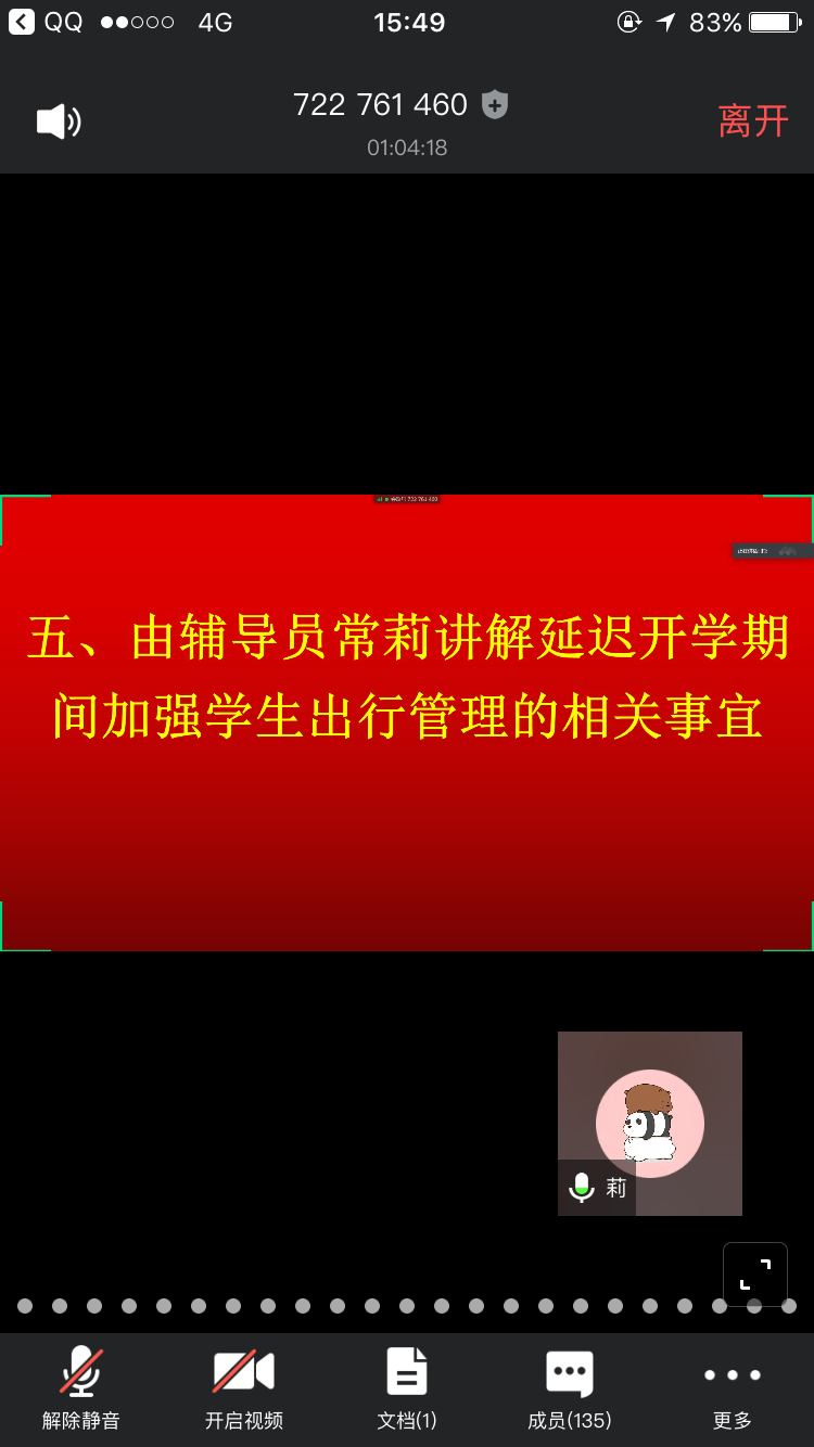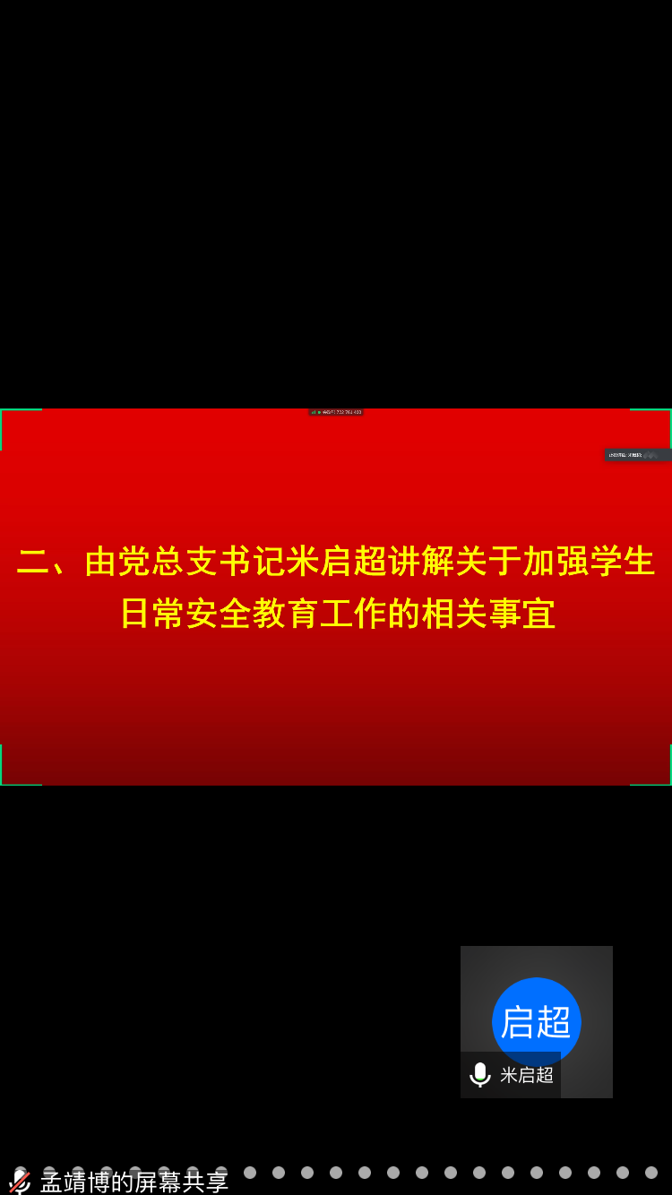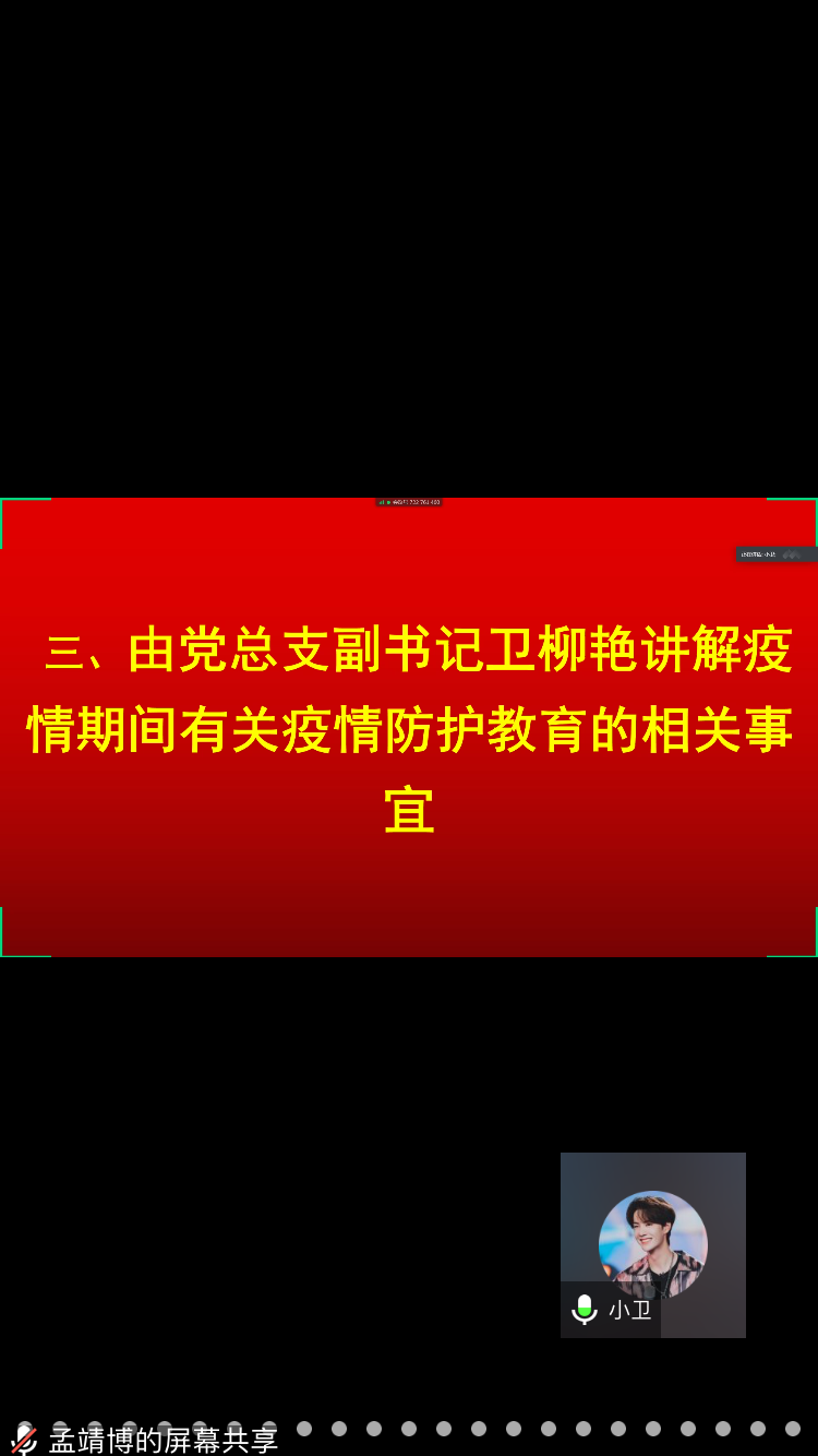 会议上,党总支书记米启超讲解关于加强学生日常安全教育工作的相关事宜。主要从日常安全教育、疫情期间特别安全问题、学业安全、金融安全、防溺水教育等多方面进行了讲解。党总支副书记卫柳艳讲解疫情期间有关疫情防护教育的相关事宜:主要从疫情期间学校对学生严谨的保护,务必让学生做到“非要事不外出,凡外出必报备”,学校的管理制度以及对于学生学业安排等三方面进行了讲解。团学办主任许东辉讲解关于学生延迟开学期间体育活动以及身体锻炼素质的相关事宜:建议同学们在疫情居家期间体育锻炼的重要性和方法等问题。辅导员常莉讲解延迟开学期间加强学生出行管理的相关事宜:强调了出行申请批准的相关事宜,同时介绍了大四学生返校后的“日常轨迹”统计管理要求。辅导员胡小光讲解疫情期间有关学生思想教育及网络安全思想教育:辨别网络谣言、不信谣、不传谣等。辅导员李方圆讲解有关疫情期间举办各种线上比赛增加学生日常生活趣味的相关事宜。