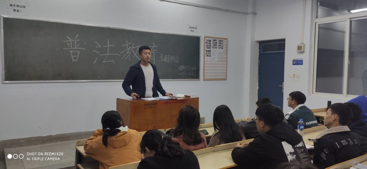 近年来,我校全面推进素质教育,高度重视学生思想道德建设,扎实开展法制安全教育活动,并取得了一定的成绩。为此我院积极组织学生开展普法教育活动,此次班会由各班班委认真准备,紧紧围绕普法活动主题,给学生讲解法制相关知识。通过一个个生动形象的案例,以学生喜爱的方式积极开展了丰富多彩的法制教育,让学生了解一些基本的法律法规,树立知法、守法的观念,增强学生的法律意识。通过提问,让学生反思自己的行为是否合法,给学生们讲解一般违法行为与犯罪行为之间的区别与联系,使同学们保持高度警惕,以防违法犯罪而后悔莫及。