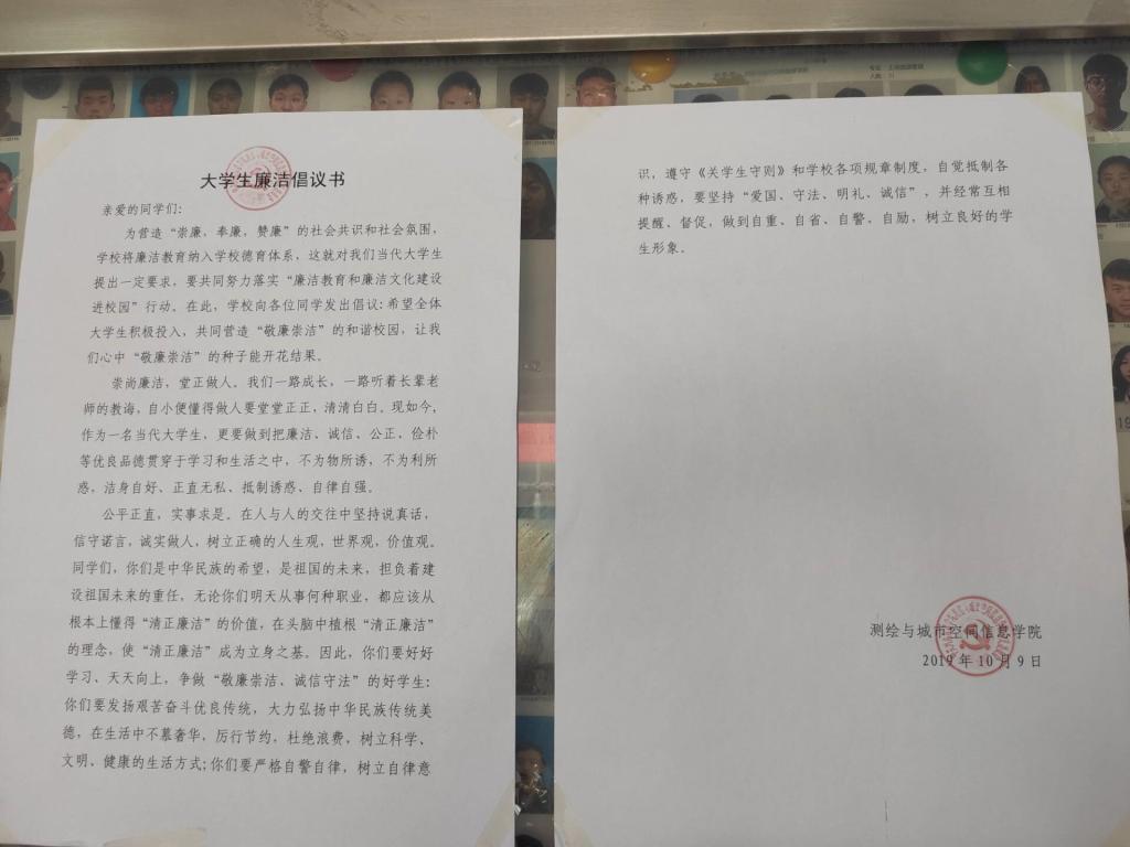 (通讯员:常莉)为深入学习贯彻习近平新时代中国特色社会主义思想和党的十九大精神,认真贯彻落实习近平总书记在全国教育大会上的重要讲话精神,结合“不忘初心、牢记使命”主题教育,进一步深化学校廉洁文化创建工作,根据《中共yl7703永利集团委员会关于开展第三届廉洁文化教育月活动的通知》安排,我院通过主题班会、征文、板报宣传、倡议书的形式,让廉洁教育更好的深入学生们的心中,同时加大宣传力度,及时将活动开展的情况特别是特色活动给予凝练和总结,利用微信、微博等新媒体形式加强宣传,形成氛围。
