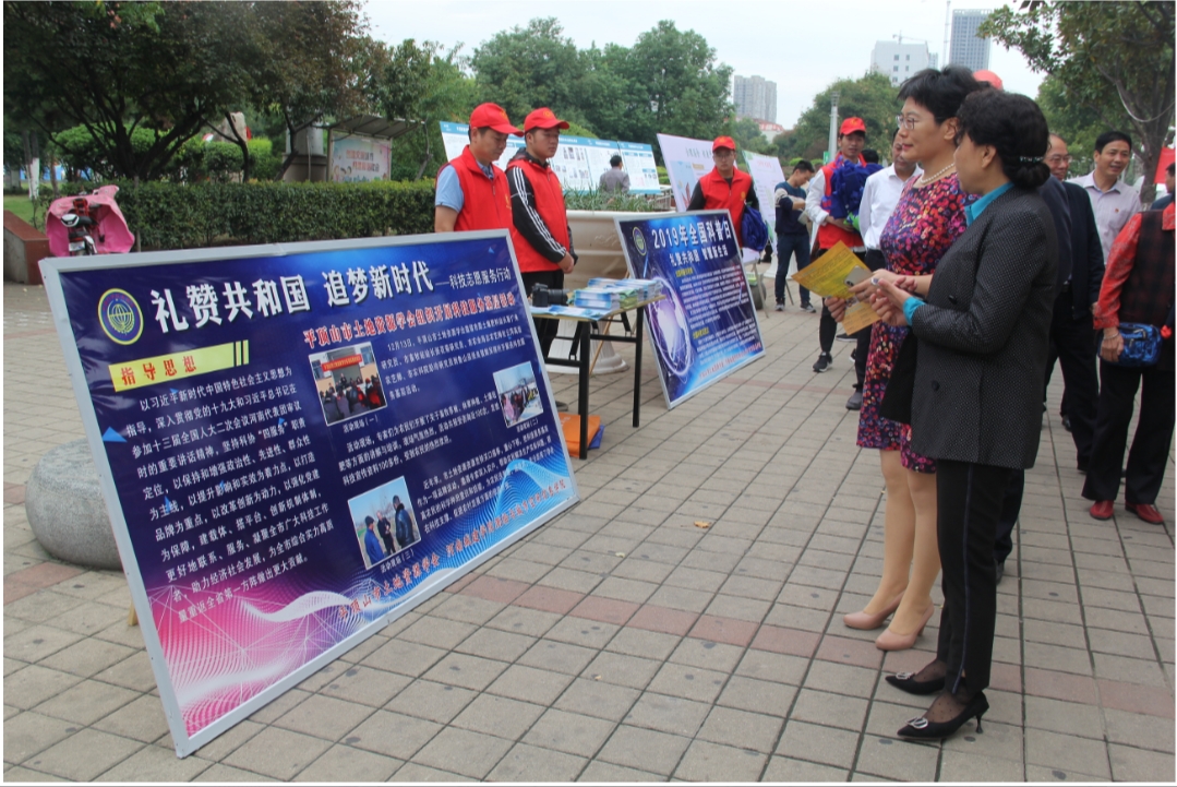 (通讯员:李艳 王润贤)由中共平顶山市委宣传部、市科协、市教体局、市科技局、市农业农村局、市卫健委主办,平顶山市科协、新华区委承办的主题为“礼赞共和国,智慧新生活”的2019年全国科普日活动于9月20日上午在平顶山市鹰城广场正式启动,并以此拉开序幕。测绘学院志愿者与平顶山市土地资源学会相关工作人员联合开展此次全国科普日活动,通过多种形式的科普宣教活动,全面普及科技创新的相关知识,提高公众的创新意识,促进科普工作的蓬勃发展。