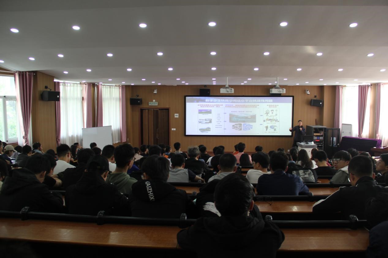(通讯员 周鹏超)2019年5月9日上午,朱庆教授应邀来我校进行了“数字孪生川藏铁路实景三维空间信息平台关键技术”学术报告。测绘学院领导班子、专业教师、学生200余人聆听报告,报告由院长张宏敏主持。朱庆教授介绍了数字孪生川藏铁路实景三维空间信息平台关键技术:从DEM到真三维GIS,从3D地表到动态三维环境的发展过程;川藏铁路面临海拔、板块活动、山地灾害和生态环境的挑战;川藏铁路最大的创新体现在绿色和智能方面;数字孪生是川藏铁路信息化的重要标志,有着颠覆性的创新思路。在报告后的互动交流环节,朱庆教授与老师、学生进行了热烈的讨论与交流。朱庆教授深厚的学术造诣扩大了在座师生的学术视野和知识范畴,提升了在座师生的创新意识和科研能力。