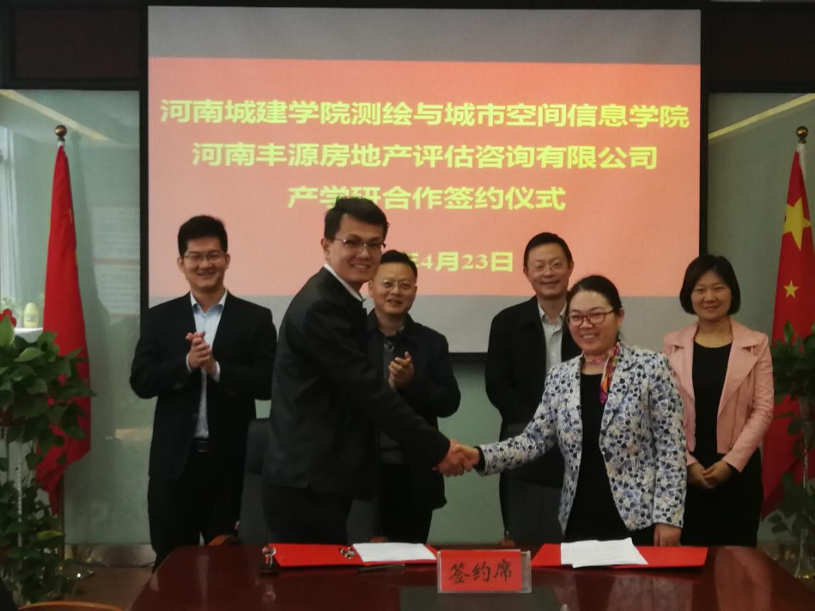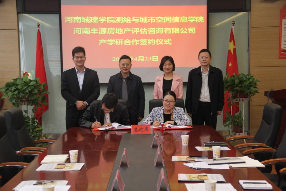 4月23日上午,我院与河南丰源房地产评估咨询有限公司产学研合作签约仪式在五号楼B座209举行。河南丰源房地产评估咨询有限公司评估部总经理巩永帅、业务部总经理杨远见、书记米启超,院长张宏敏。院长张宏敏和巩永帅总经理代表双方签署了产学研合作协议书。