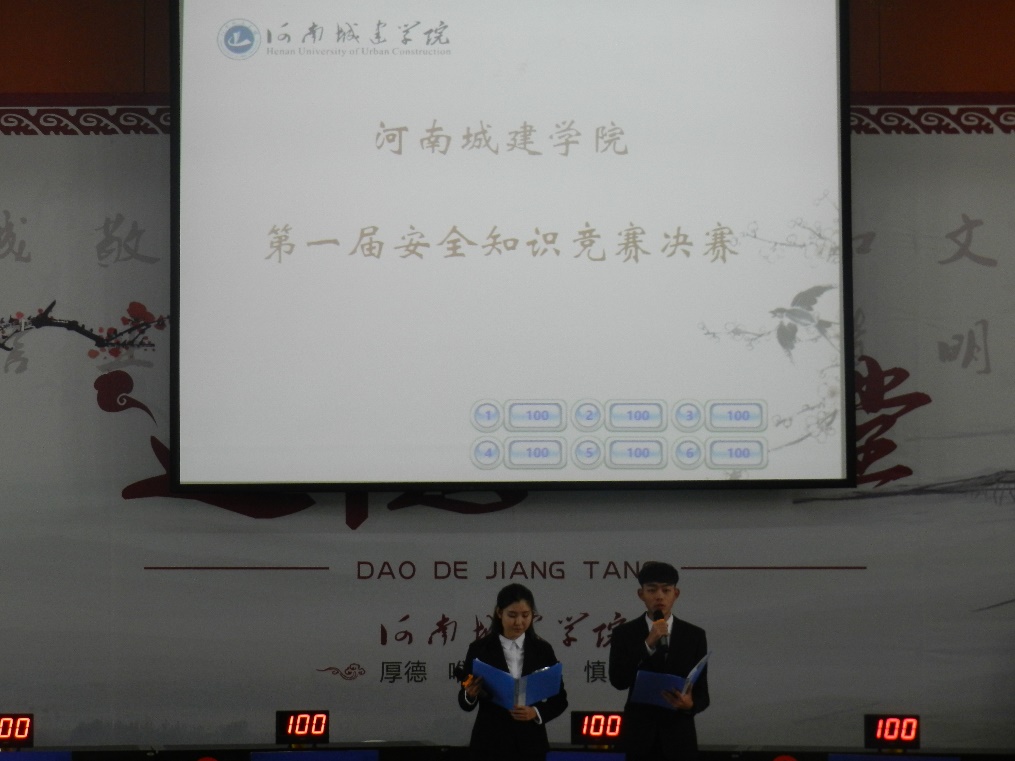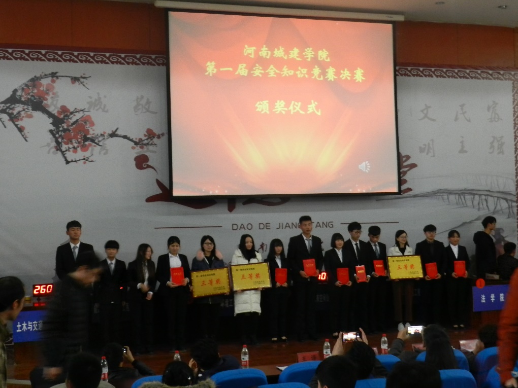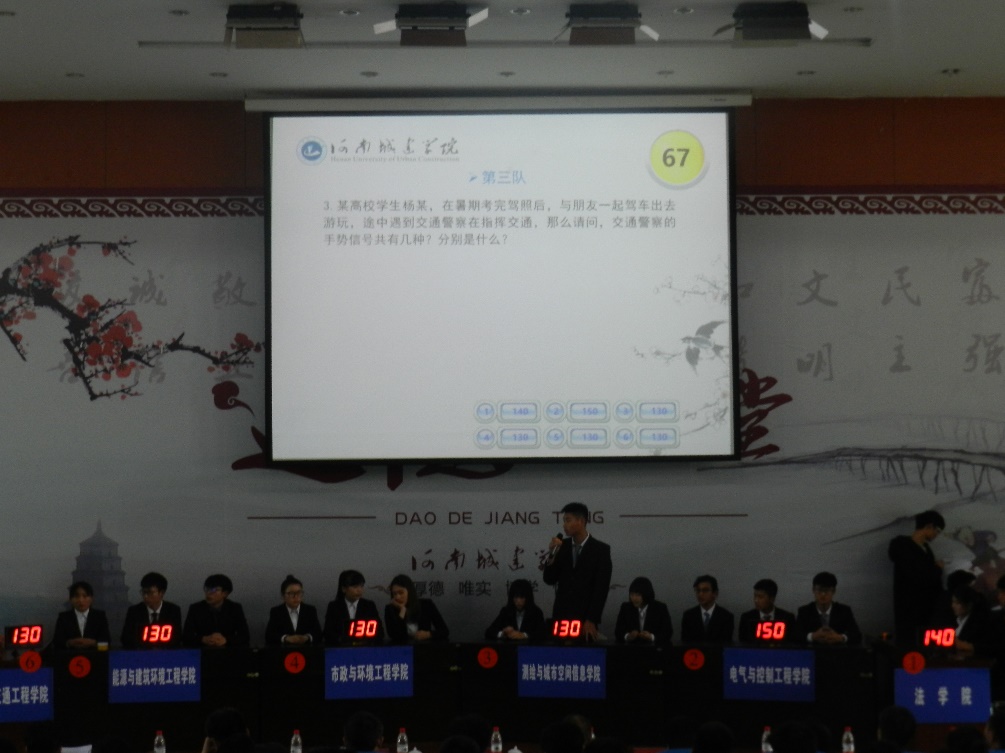 (通讯员:赵云娇 刘昀昊)为全面普及大家的安全知识,强化校园安全文化教育,大力营造校园安全文化氛围,我校组织开展了安全知识竞赛活动。经过紧张的筹备和激烈的初赛、复赛阶段,安全知识竞赛决赛于12月25日下午在图书馆报告厅拉开帷幕。进入本次安全知识竞赛决赛的是测绘学院、土交学院、电气学院、能源学院、市政学院、法学院。副校长王靖,各学院党委书记观看本次比赛。本次比赛由测绘学院、土交学院承办。