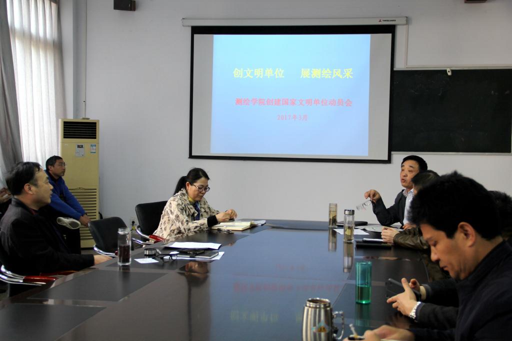 (通讯员 杨甲)为做好我院2017年度文明创建工作,3月28号下午3点,测绘学院特召开创建国家文明单位动员会,党总支书记吕鹏飞主持会议,为全体教师做文明创建工作再部署。