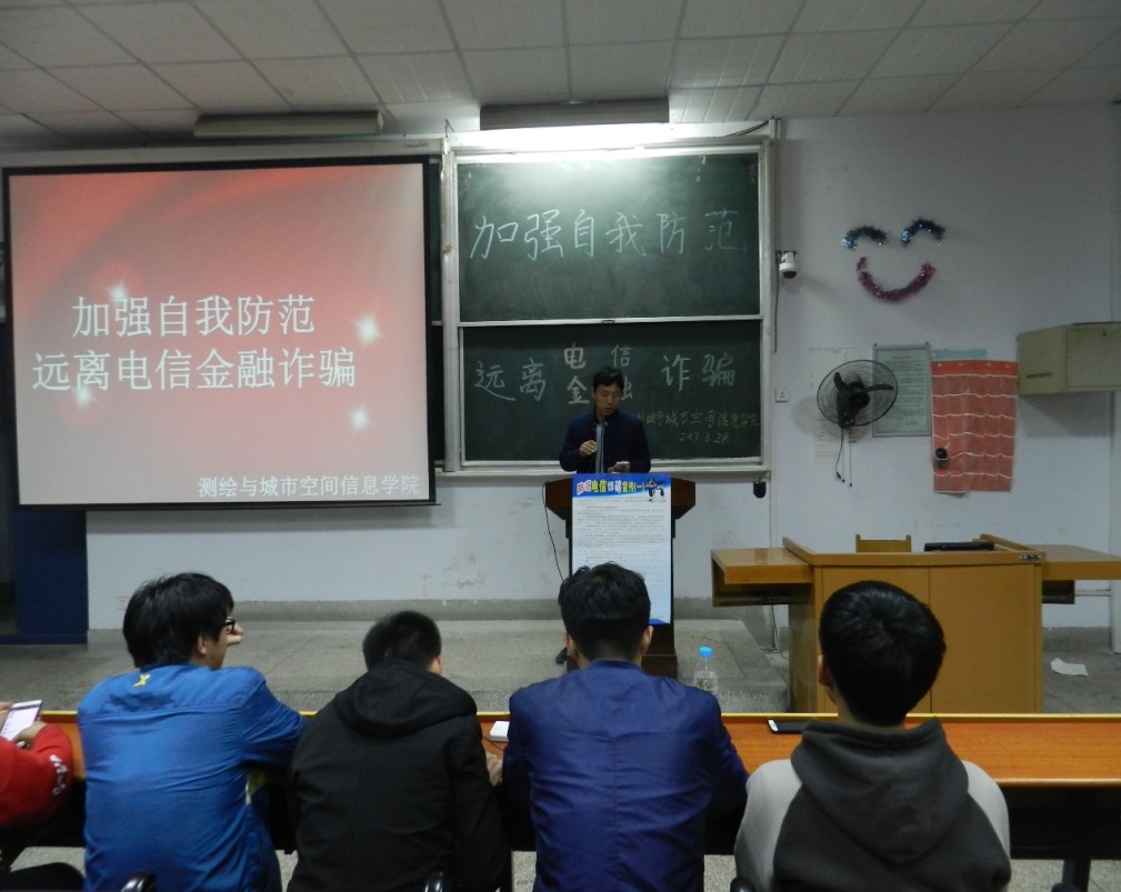 (通讯员:程瑞瑞,朱高昊)为了普及安全防范知识,提高学生防诈骗意识,我院于3月28日晚上7点30分在5号楼C#316阶梯教室举办了“大学生防诈骗安全知识” 讲座。本次讲座由我院团学办老师许东辉主持,我院大一全体学生参加讲座。