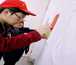 这次活动有两位部长带领,于10月29日上午八点在五号楼门口集合,然后大家分组,书写,并粘贴文明标语,活动进行秩序良好,在自习室中两个部门相互配合,取长补短,制作了“静以修身,学以育德”“戒骄戒躁,心平气和”“己所不欲,勿施于人”等多幅文明标语,并在分组的形式下对全系四个楼层进行了文明标语的更换和添补。