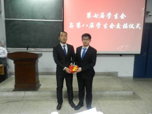 然后由第七届学生会主席陈俊峰的做《工作报告》,并进行审议。最后由团总支书记腾飞宣布第八届主席团成员名单。在热烈的掌声中,新一届学生会主席孙连松发表就职演讲。两届学生会主席举行工作交接仪式。