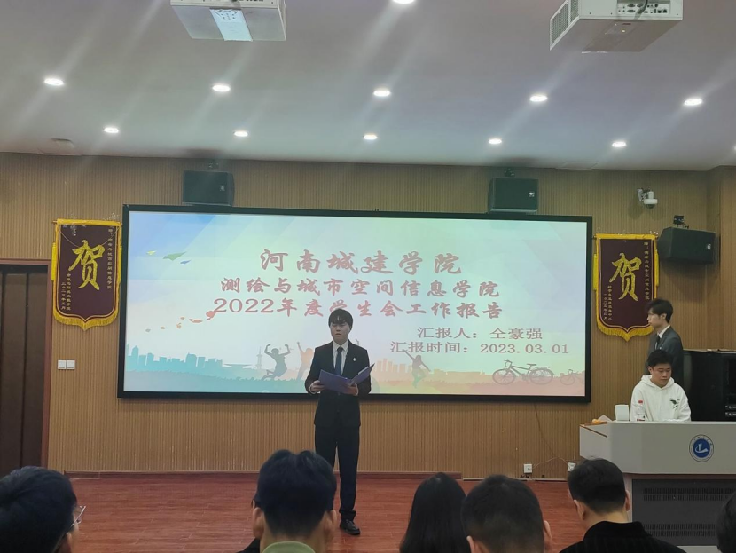 大会在庄严的《国歌》声中拉开序幕。首先由团学办副主任常莉致开幕词。回顾过去的一年,她由衷感激第十四届学生会主席团成员的突出表现,并殷切希望第十五届学生会成员能够肩负起重任,砥砺前行;随后,第十四届学生会执行主席仝豪强向全体成员作述职报告;随后辅导员郭军学宣读了第十五届学生会主席团成员名单;新一届执行主席蒋永泰代表第十五届学生会主席团作就职报告。