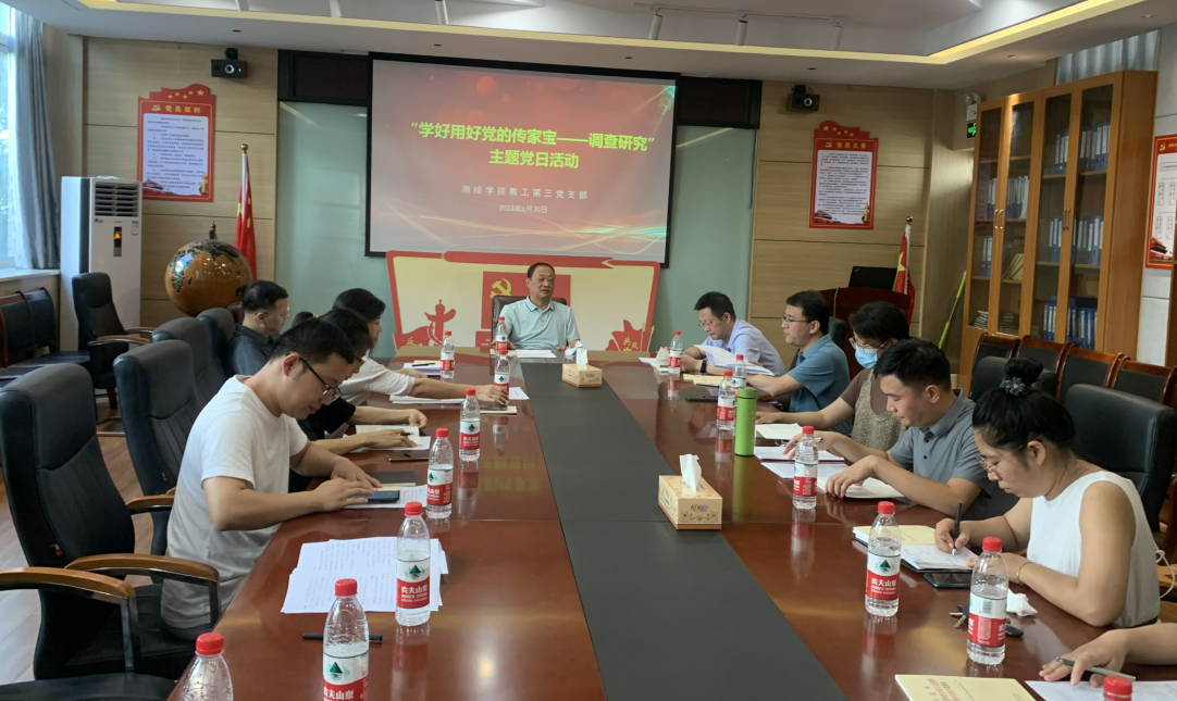 (通讯员:郭军学)为积极响应党中央关于“全党大兴调查研究”的号召,不断深入推进学习贯彻习近平新时代中国特色社会主义思想主题教育走深走实,6月30日下午,测绘与城市空间信息学院教工第三党支部全体党员在5号楼B209会议室开展“学好用好党的传家宝——调查研究”主题党日活动。副校长贺国营以普通党员身份参加活动,学院党委书记米启超、院长高松峰、党委副书记卫柳艳列席。本次活动由党委副书记卫柳艳主持。