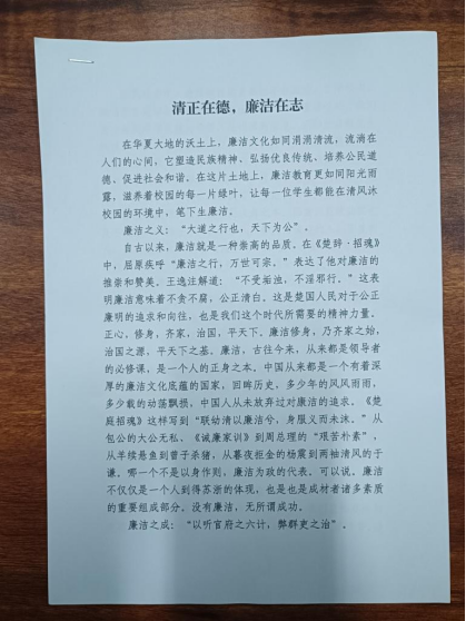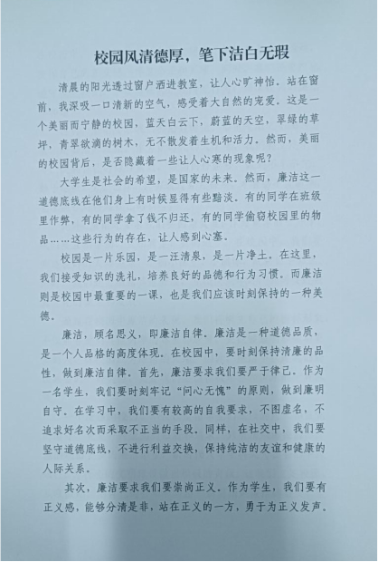 (通讯员:李佳怡)为深入学习贯彻落实党的二十大精神,进一步丰富校园文化生活,营造浓厚的书香校园氛围,弘扬清正廉洁、克己奉公的时代精神,激发学生阅读和写作的热情。2023年10月,yl7703永利集团开展了以“清风沐校园,笔下生廉洁”为主题的征文比赛。