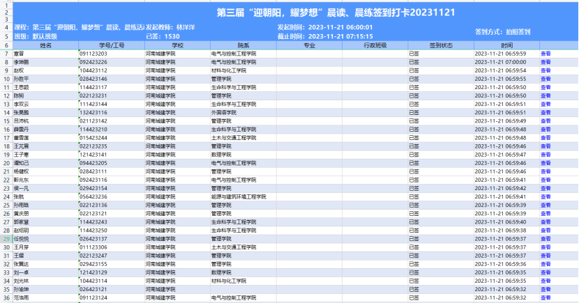 活动第一天,近2000名学生参与,有效签到打卡达1500余次。同学们迎着朝阳“打卡”,晨起锻炼,朗诵经典,热情不熄,收获满满!让我们一起来看一下同学们早起打卡、晨读晨练的精彩的瞬间吧!