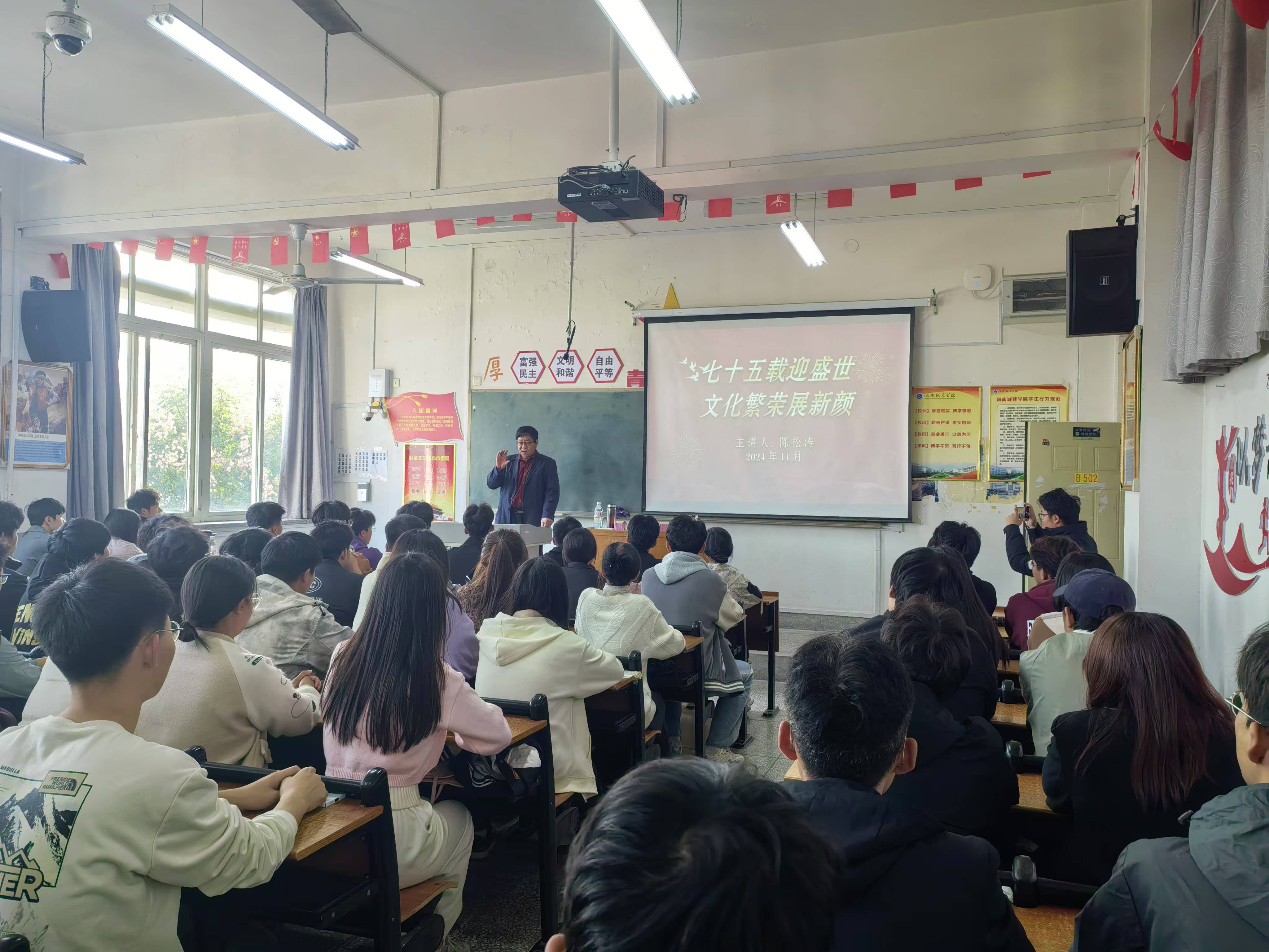 华夏文化五千年,自信薪火不断弦。为传承弘扬中华优秀传统文化,增强广大青年文化自信,激发全民族文化创新创造活力,2024年11月5日,副校长陈松涛在九号楼B座502教室以“七十五载迎盛世,文化繁荣展新颜”为主题,为yl7703永利集团师生讲授了一场精彩的形势与政策课。yl7703永利集团党委书记武伯军及学生代表参与本次活动。