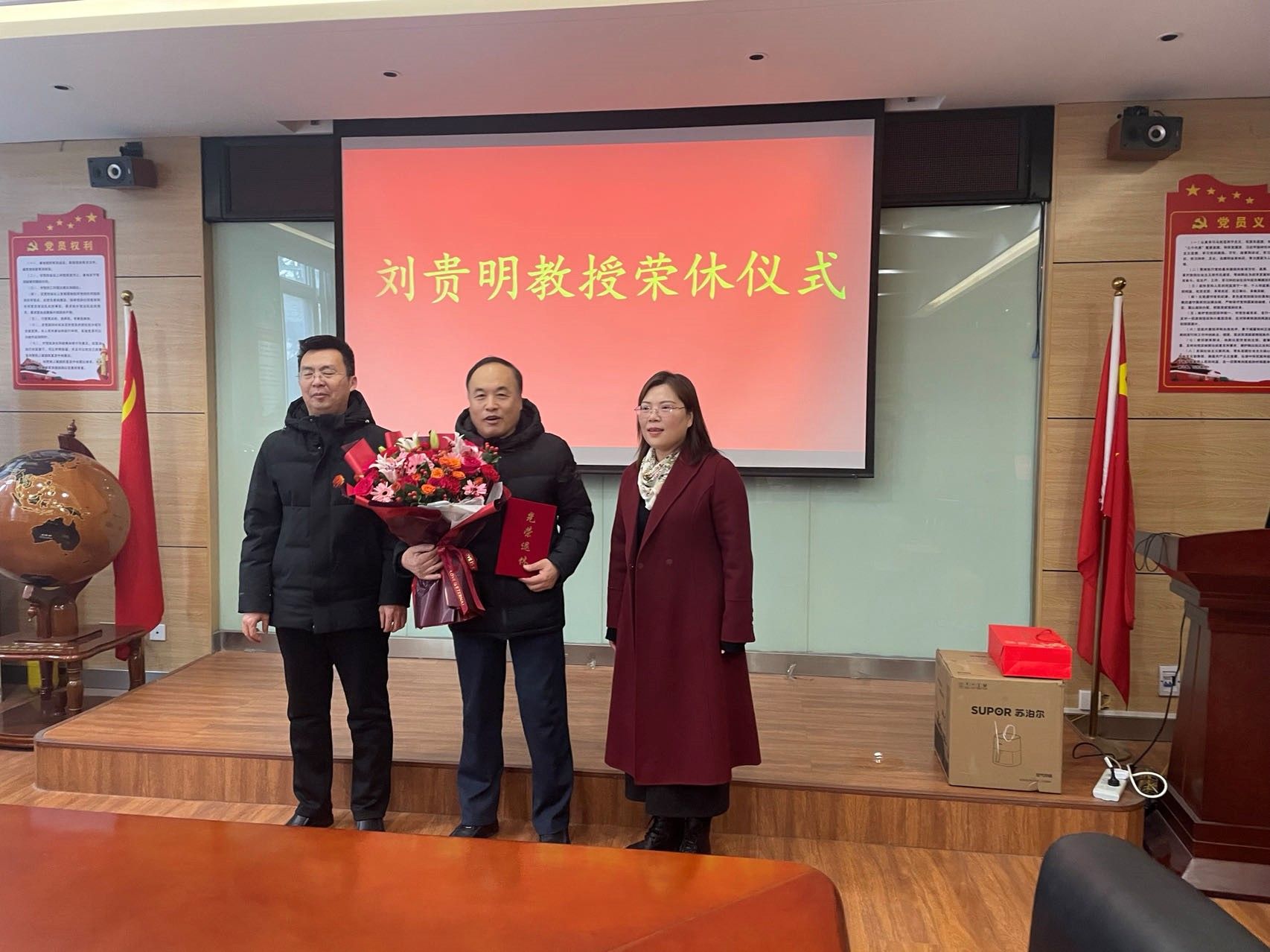 接下来,学院领导向刘贵明副教授赠送了美丽的鲜花和荣誉证书,以此表达对其多年辛勤工作的感激与敬意。随后,教师代表纷纷发言,分享了与刘贵明副教授共事的美好回忆,言语中充满了对前辈的敬仰与不舍。