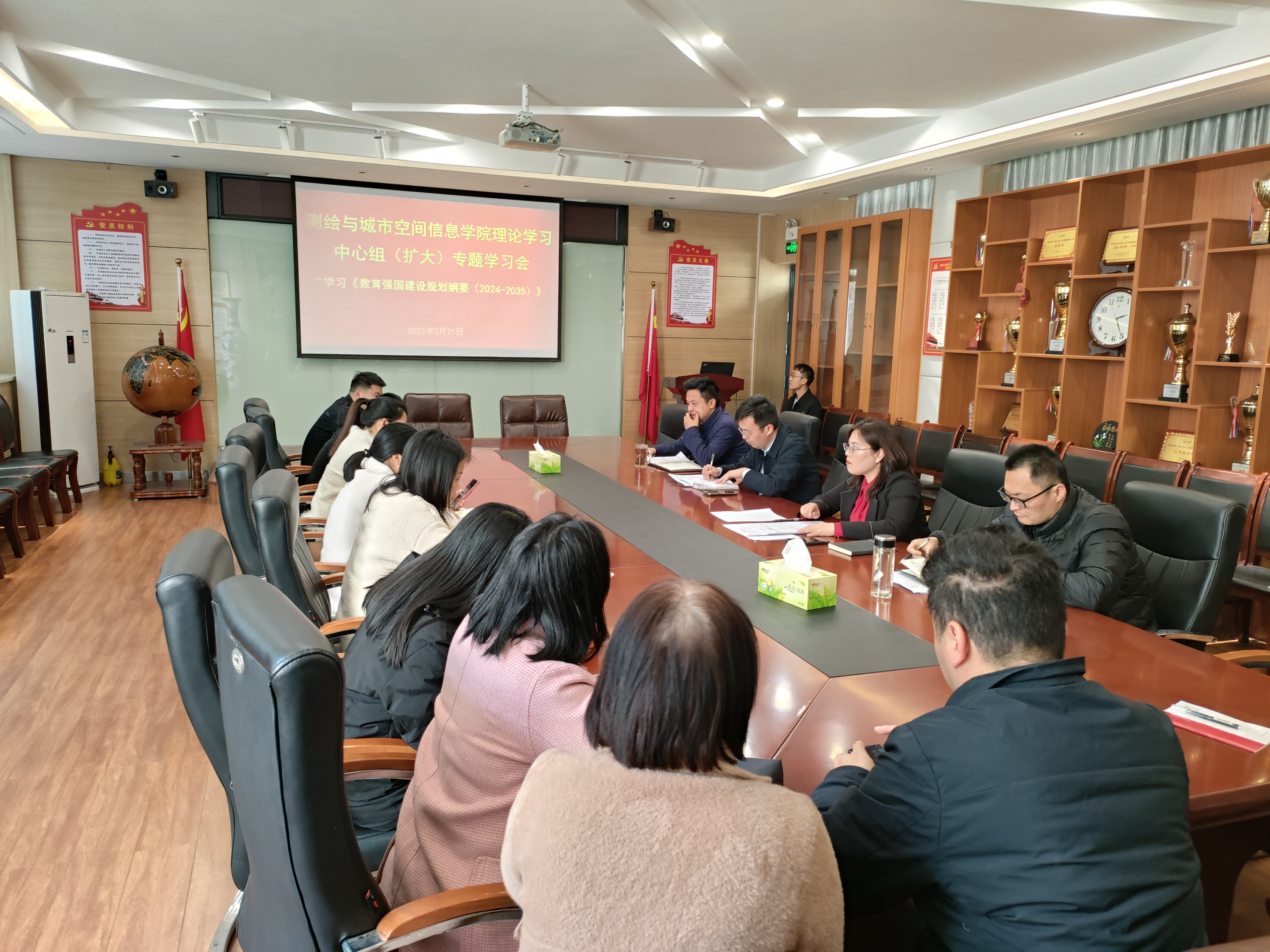 会议强调,一是坚持以习近平新时代中国特色社会主义思想为指导,深入贯彻党的二十大和二十届二中、三中全会,全面贯彻习近平总书记关于教育的重要论述,落实立德树人根本任务,为党育人、为国育才,全面服务中国式现代化建设;二是深入系统学。把学习贯彻《纲要》精神作为当前和今后一个时期的重要任务,我们按照学校党委部署要求,把学习贯彻《纲要》与学习贯彻习近平总书记关于教育的重要论述,引导我院党员干部把思想与行动统一到党中央决策部署上来,为教育强国建设贡献“测绘”力量。三是学院党委要切实扛起政治责任,履行战略使命,找准学院发展定位,强化师生思想政治教育,大力推进党建与业务“双融双促”。