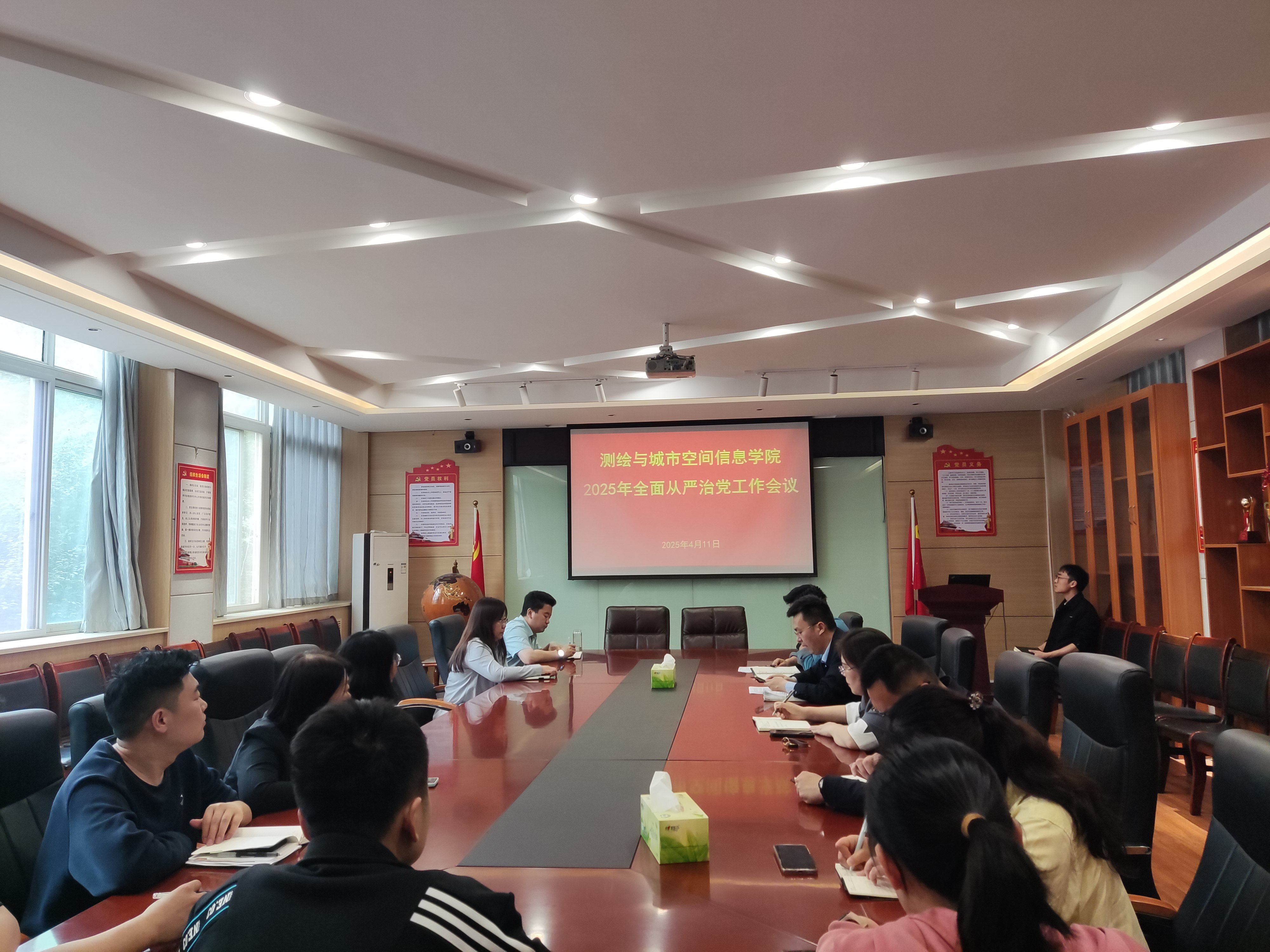 测绘与城市空间学院党委于4月11日下午召开2025年全面从严治党工作会议,学习贯彻落实学校2025年全面从严治党工作会议精神。党委书记武伯军主持会议并讲话,学院党政班子成员、部门负责人、各党支部书记及系主任参加了会议,会议由党委书记武伯军主持。