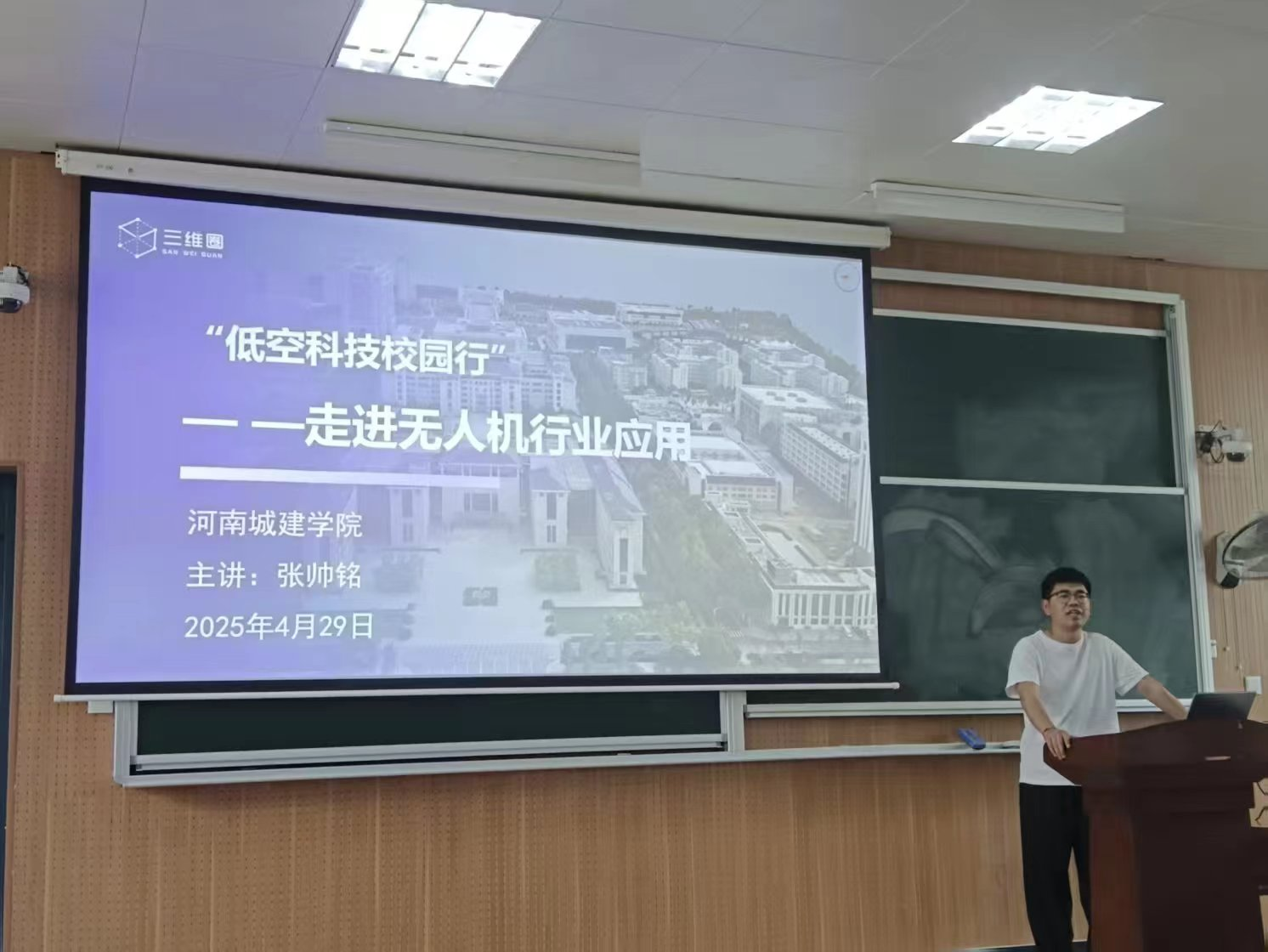 讲座伊始,三维圈公司高级讲师张帅铭从国家低空经济发展战略切入,系统介绍了无人机技术的最新进展及其在测绘、物流、应急救援、智慧城市等领域的应用场景。他结合公司实际案例,展示了无人机三维建模、高精度遥感测绘、低空物流网络建设等技术的落地成果,并强调:“低空经济正成为推动区域经济高质量发展的新引擎,而人才与技术是这一领域的核心驱动力。”在互动环节,学生们围绕“无人机技术门槛”、“低空经济就业前景”、“行业数据安全挑战”等问题踊跃提问。最后,张帅铭结合行业趋势与学生职业规划,提出建议:“复合型人才更受青睐,建议同学们在夯实测绘专业知识的同时,拓展人工智能、大数据等跨学科技能。”现场气氛热烈,掌声不断。