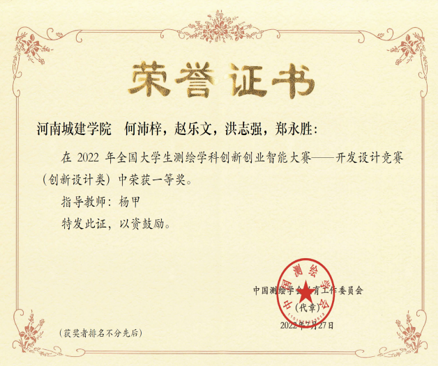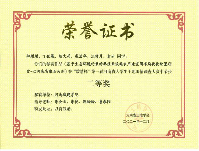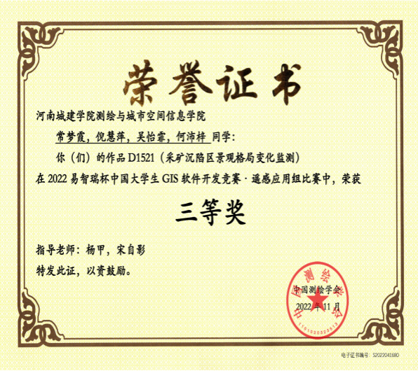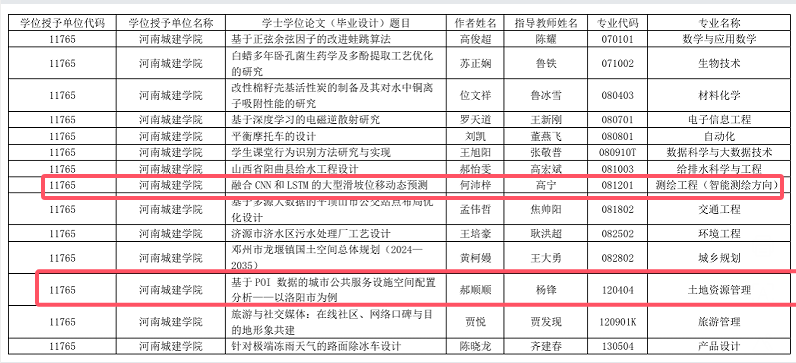 在2024年河南省优秀学士学位论文评选中,我院何沛梓同学的《融合CNN和LSTM的大型滑坡位移动态预测》和郝顺顺同学的《基于POI数据的城市公共服务设施空间配置分析——以洛阳市为例》荣获河南省优秀学士学位论文,高宁老师和杨锋老师荣获河南省优秀学士学位论文指导教师。
