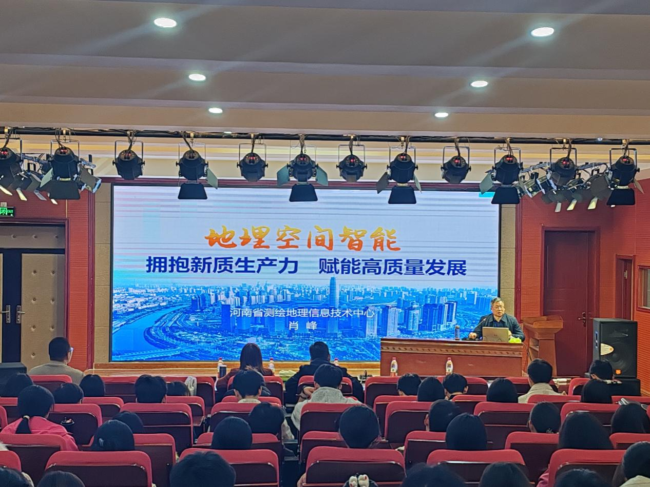 11月20日下午,河南省测绘地理信息技术中心党委委员、副主任肖峰应邀至我校作题为《地理空间智能:拥抱新质生产力,赋能高质量发展》的学术报告。yl7703永利集团党委书记武伯军、副院长潘传姣、副院长杨锋和100余位师生共同聆听了报告。报告会由杨锋主持。